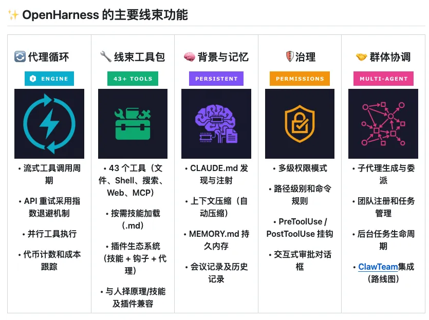 openharness/engine/ # Agent Loop — query → stream → tool-call → looptools/ # 43 Tools — file I/O, shell, search, web, MCPskills/ # on-demand skill loading (.md files)permissions/ # multi-level modes, path rules, command denyhooks/ # PreToolUse/PostToolUse lifecyclecommands/ # 54 Commandsmemory/ # persistent cross-session knowledgecoordinator/ # subagent spawning, team coordination