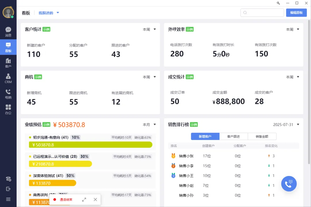 3、录音日报,有效接通量,平均时长统计,客户去重,意向客户跟进工单提醒,公海客户;