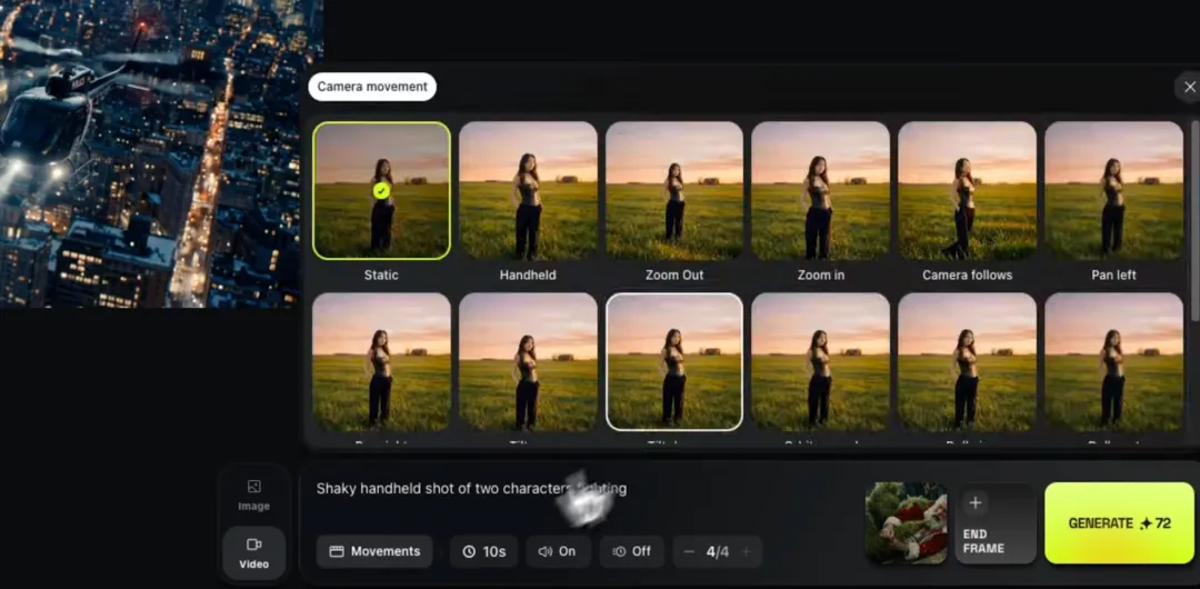 虚拟摄影包中包含ARRI Alexa 35、Red V-Raptor、IMAX胶片摄影机等6种专业电影摄影机,Panavision C系列、Canon K-35、Hawk V-Lite等11种镜头,4种焦距,3种光圈。为使生成图像更具“电影感”,Higgsfield开发了一套内置18种电影级复杂镜头运动的预设,包括推进(Dolly In)、拉出(Dolly Out)、无人机镜头(Drone Shot)、360度旋转(360 Roll)等。
