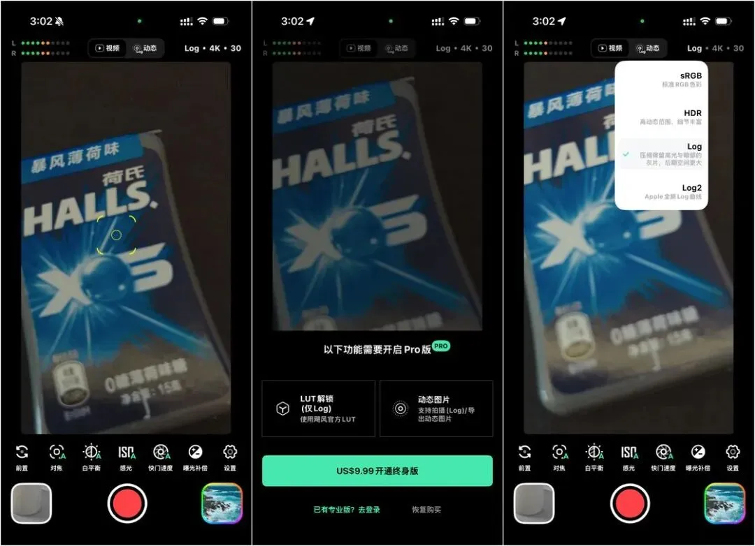 该APP内置多款电影级调色LUT(查找表),支持Apple Log等格式视频拍摄,提供对焦、曝光、白平衡等专业参数的手动调节,用户还可通过额外付费实时套用更加丰富的专业电影大师调色LUT,以实现对细节的精准掌控。此外,用户可通过一键分享功能,将调色完成的视频直接生成动态照片(Live Photo)并发布至社交平台。