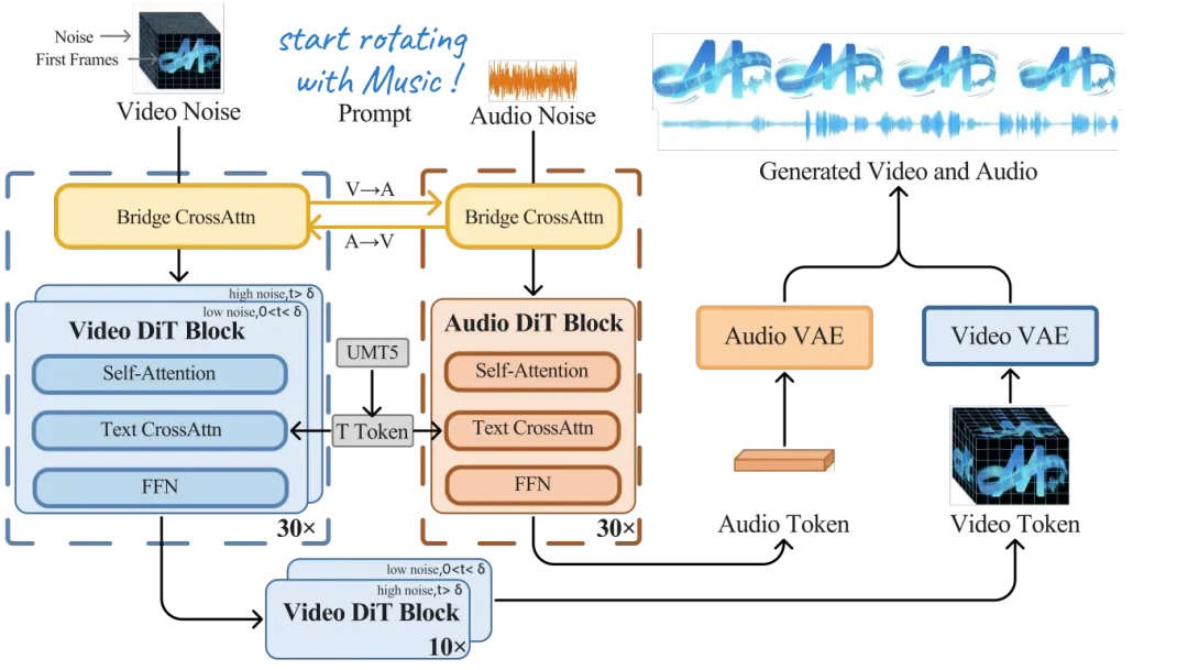 ▲MOVA通过双向桥接模块将视频与音频DiT主干网络耦合在一起
