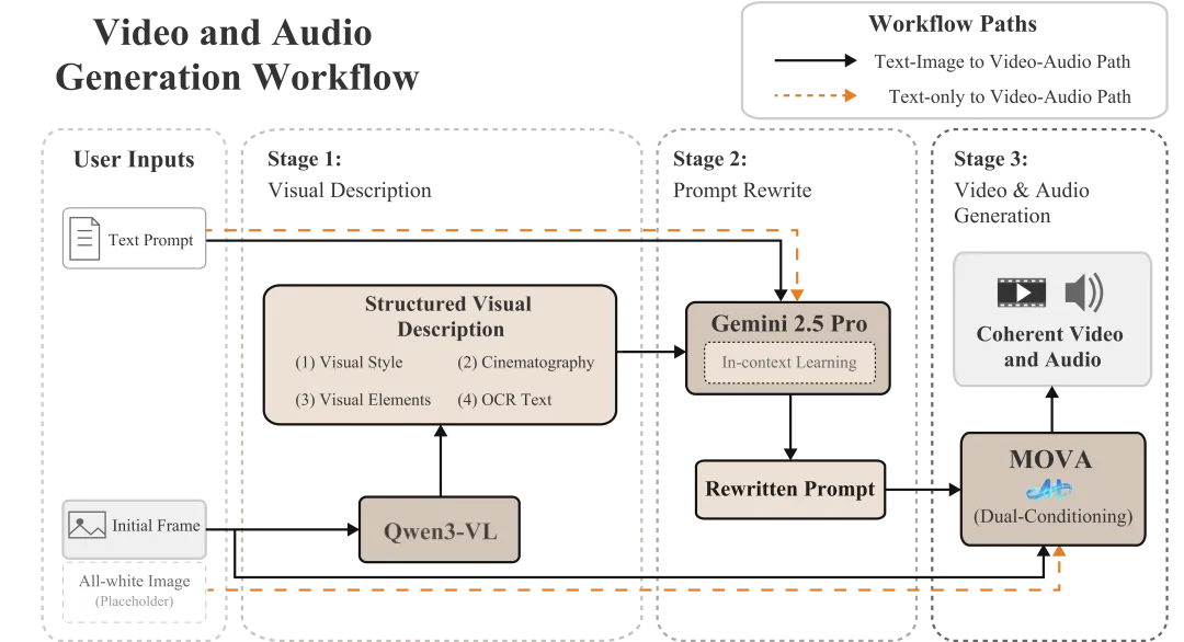 在MOVA的实际部署中,研发团队设计了一套三阶段协同工作流。首先通过Qwen3-VL对用户提供的初始帧进行结构化视觉解析,将画面的核心元素抽取为视觉描述;其后借助通用大语言模型(LLM)进行上下文示例驱动的提示词重写,将用户需求转译为更贴近训练分布、具备动态叙事的提示词;最后结合重写后的提示词和初始帧图像进行双重条件生成,使视频在物体运动与画面变化上最大化保持初始帧的视觉风格与关键元素,并更好地对齐用户意图。