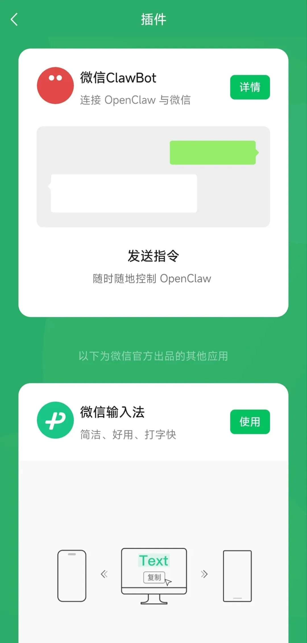 打开微信,点击我,进入设置,再点击插件。原先没更新的时候只有一个微信输入法,现在多了一个Clawbot插件。