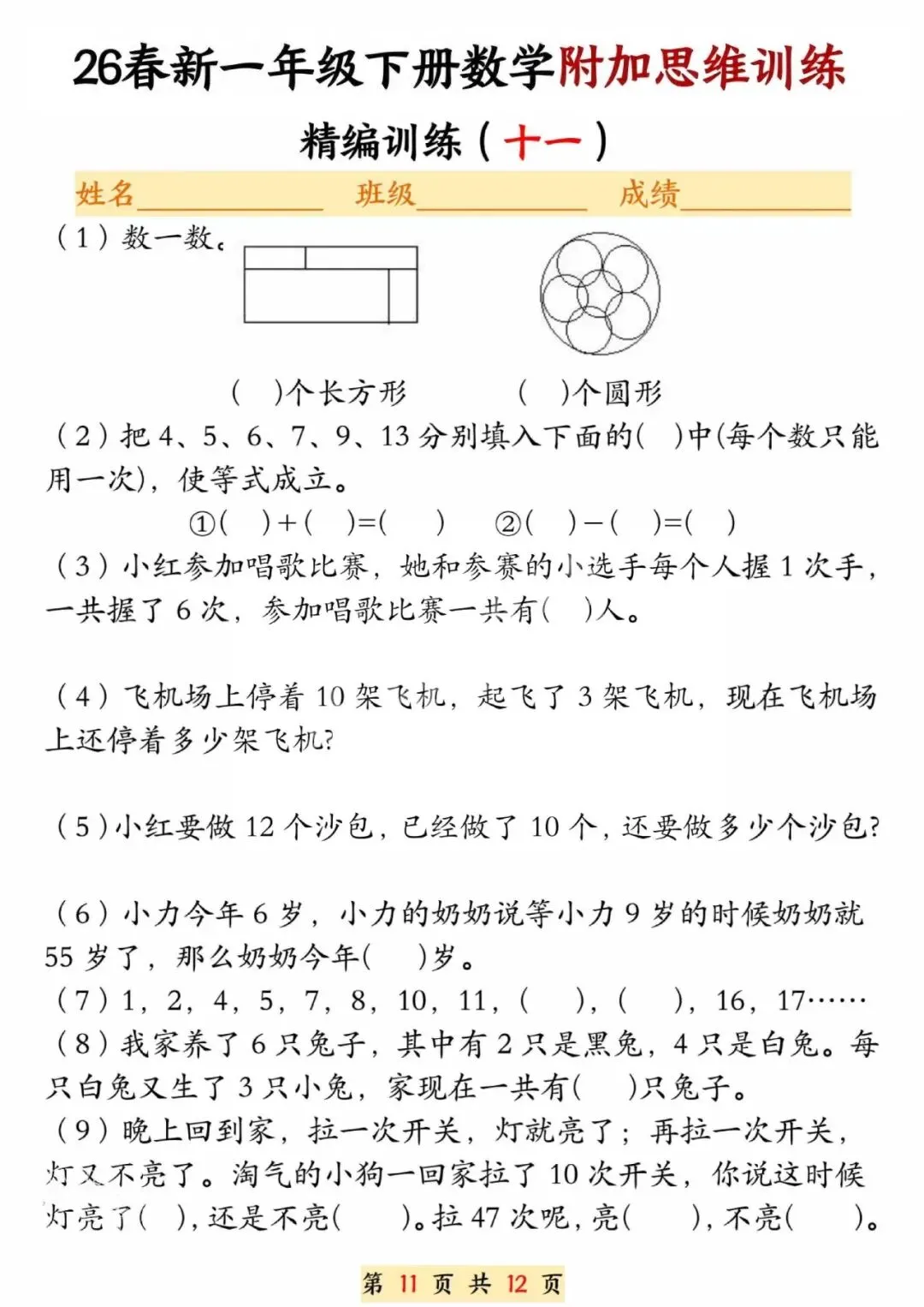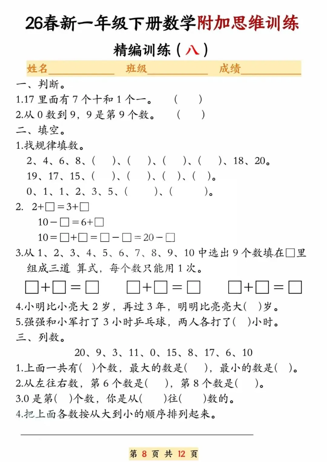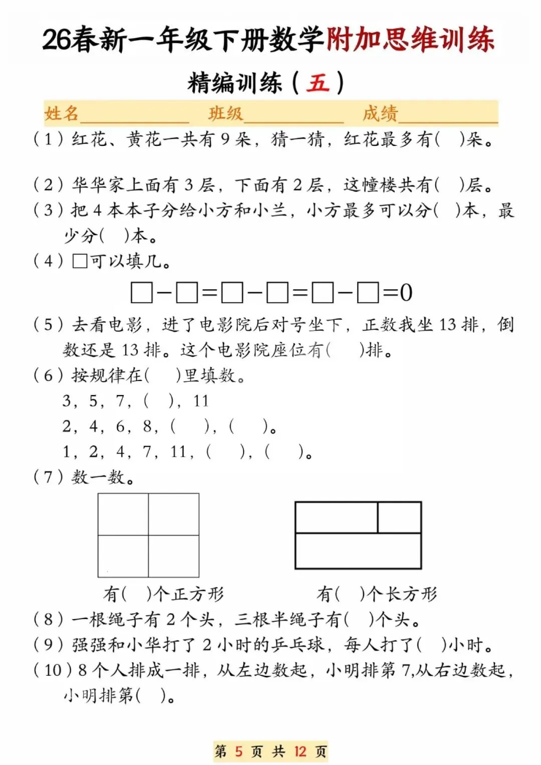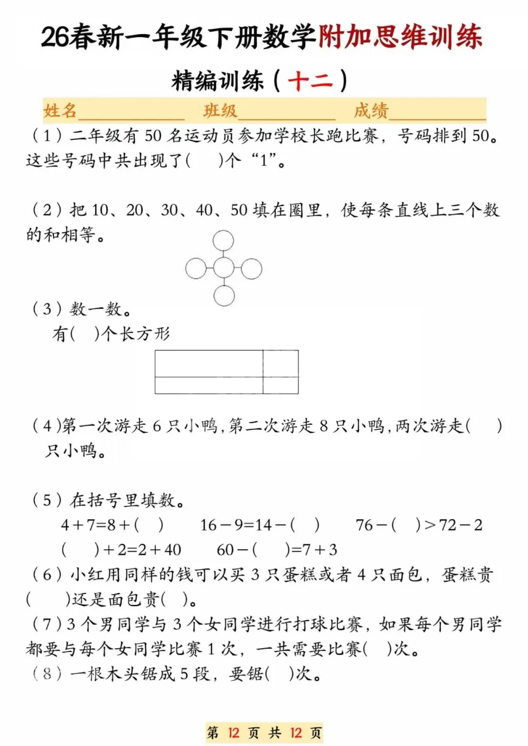 26春一年级下册数学附加思维训练题,电子版可打印