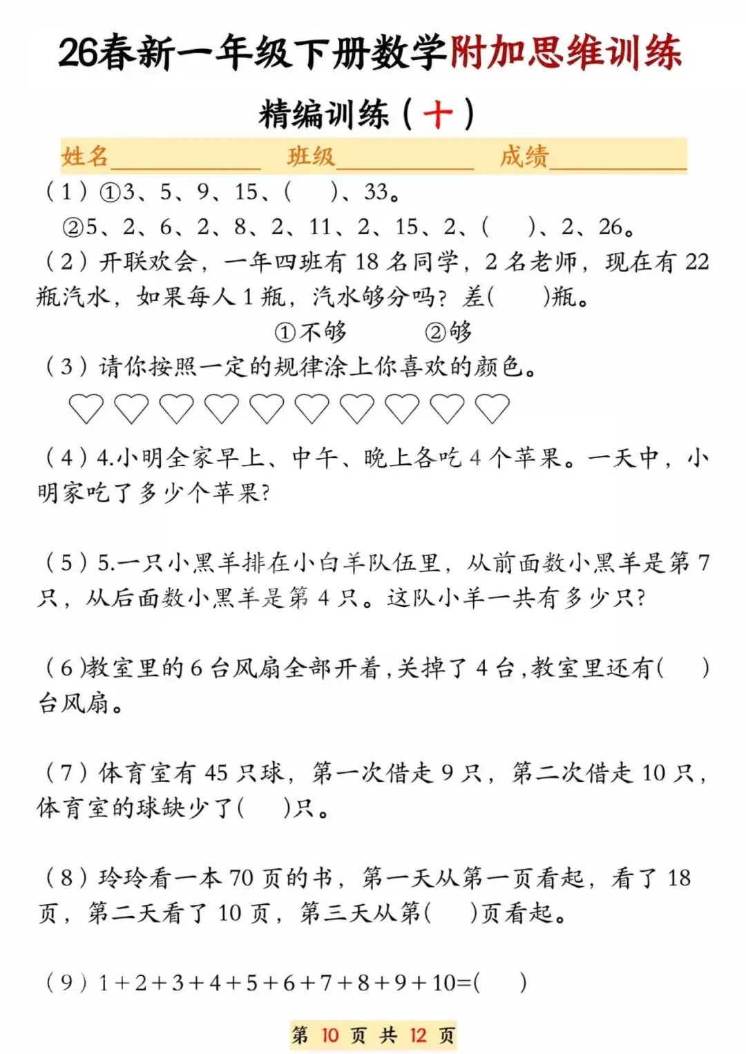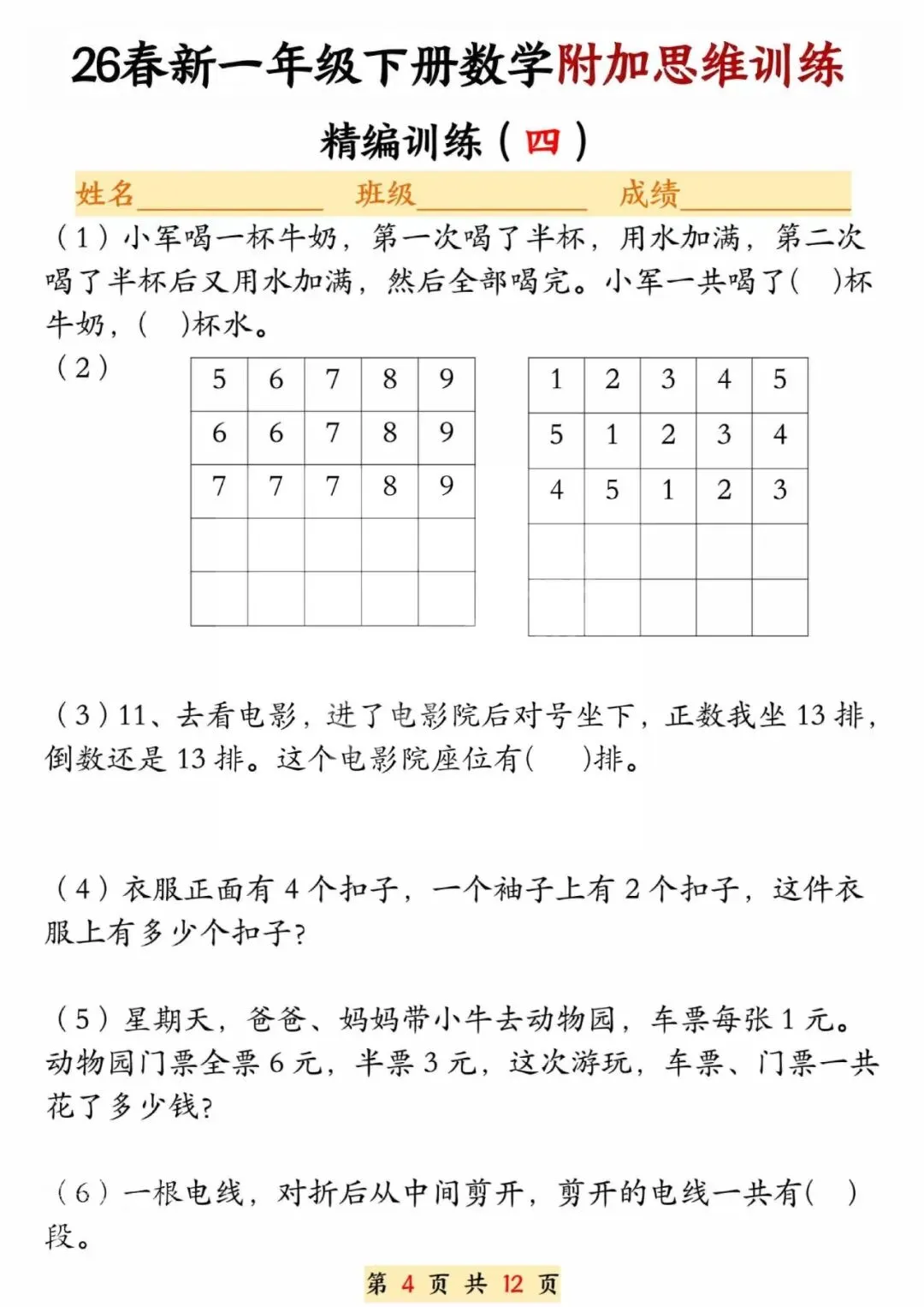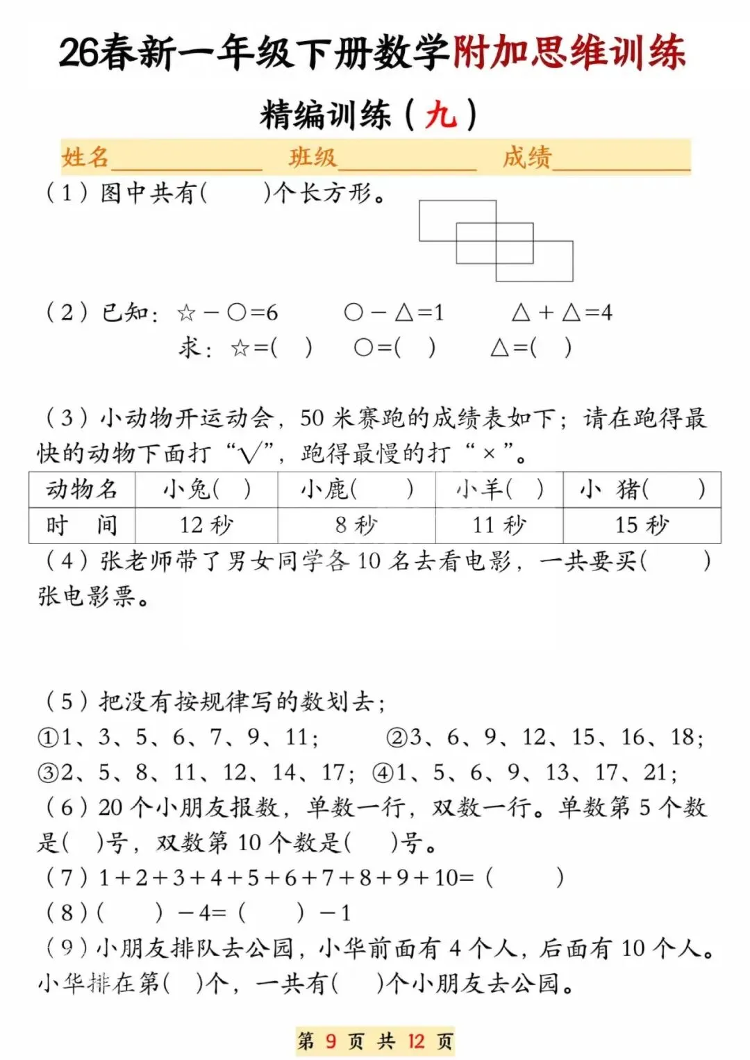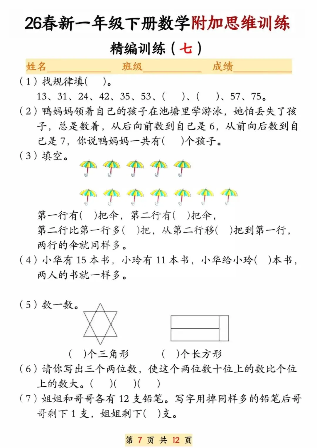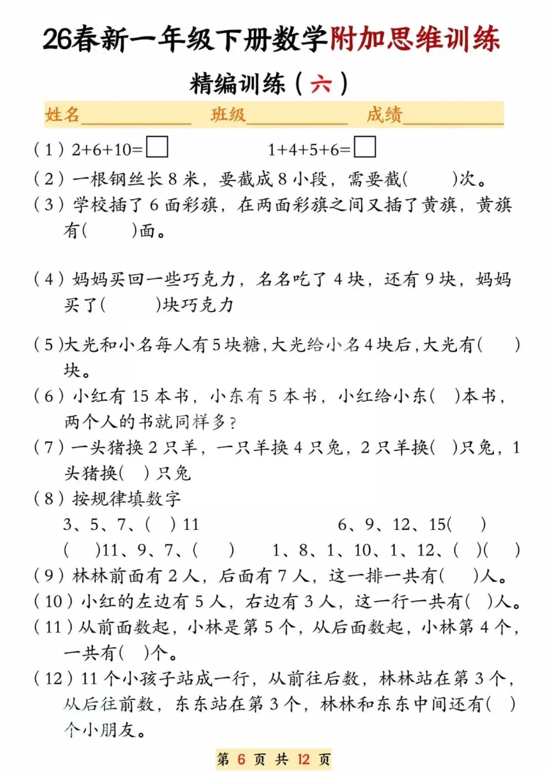 26春一年级下册数学附加思维训练题,电子版可打印