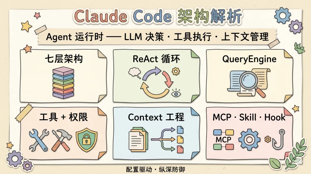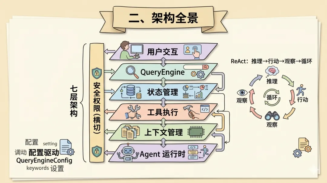 Claude Code 的答案是七层架构 + 配置驱动 + ReAct 循环。七层从上到下分别负责用户交互、对话引擎、状态管理、工具执行、上下文管理、Agent 运行时和安全权限,每层有明确的职责边界和接口契约。