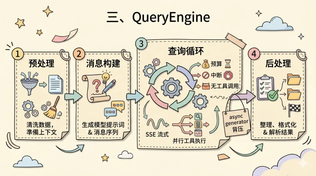 ┌──────────┐ ┌──────────┐ ┌──────────┐ ┌──────────┐│ 预处理 │ → │ 消息构建 │ → │ 查询循环 │ → │ 后处理 ││ │ │ │ │ │ │ ││ 消息规范化│ │ 组装System│ │ LLM 调用 │ │ 会话持久化││ Slash 解析│ │ Prompt │ │ 工具执行 │ │ Token 统计││ 上下文注入│ │ 历史+输入 │ │ 结果反馈 │ │ 状态更新 │└──────────┘ └──────────┘ │ 循环判断 │ └──────────┘ └──────────┘