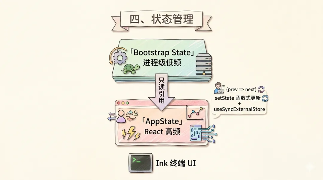 Claude Code 的方案是双层状态模型:Bootstrap State(进程级单例)承载低频配置,AppState(React 响应式状态树)承载高频交互数据。AppState 可读取 Bootstrap State,反之不行。