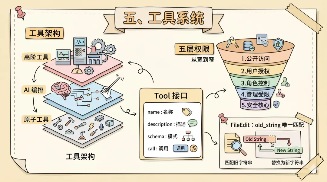 工具系统是 Agent 连接真实世界的双手。前几章解决了「如何思考」和「如何记忆」,这一章回答:如何让 LLM 安全、可控、可组合地操作外部环境? Claude Code 的设计可以概括为:统一接口 + 三层架构 + 依赖注入 + 五层权限链。