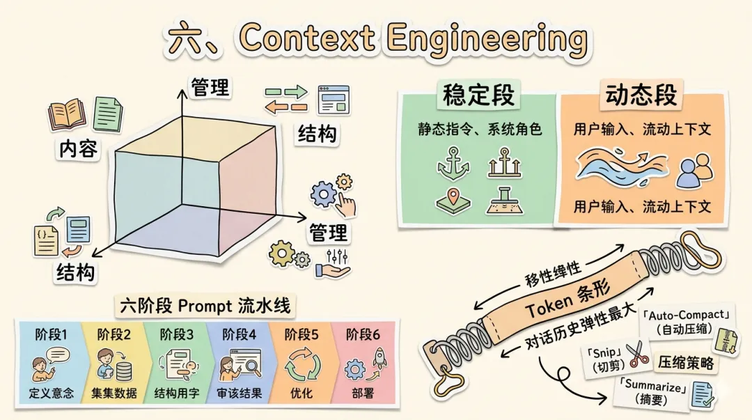 • Context Engineering 是 Agent 区别于简单 LLM 应用的分水岭——Agent 的上下文消耗速度是纯对话的 5-10 倍。 • 稳定段与动态段分离不是优化技巧,而是架构决策——设计之初就要考虑信息的变化频率。 • 压缩策略要分级:轻度用折叠,中度用 LLM 摘要,重度用裁剪。 • 为上下文设硬预算(25K 截断、2000 字符 git status、10 条保护区),没有硬约束的资源最终都会被耗尽。