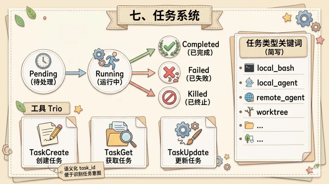 Agent 运行时中存在多种截然不同的执行形态——本地 Shell 子进程、独立的 QueryEngine 子 Agent、云端远程 Agent、长期驻留的 MCP 监控。它们的启动方式、生命周期、输出格式完全不同。任务系统(Task System)用七种任务类型 + 统一状态机 + 语义化 ID 将这些异构执行单元收归一套管理接口,同时解决异步任务的进度追踪和可读性标识问题。