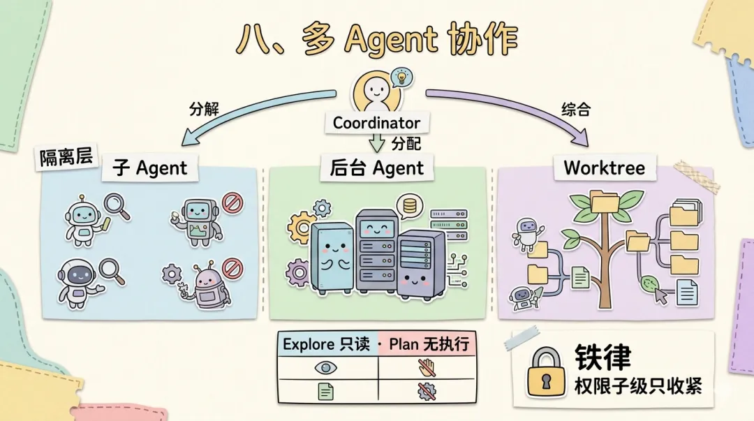 子 Agent 最轻量,共享文件系统,修改立即可见。后台 Agent 增加异步执行——主 Agent 不必等待。Worktree 隔离最重量级:利用 Git worktree 为每个 Agent 创建独立工作目录副本,从根本上消除文件冲突,创建开销远低于 clone(共享 .git 对象数据库)。