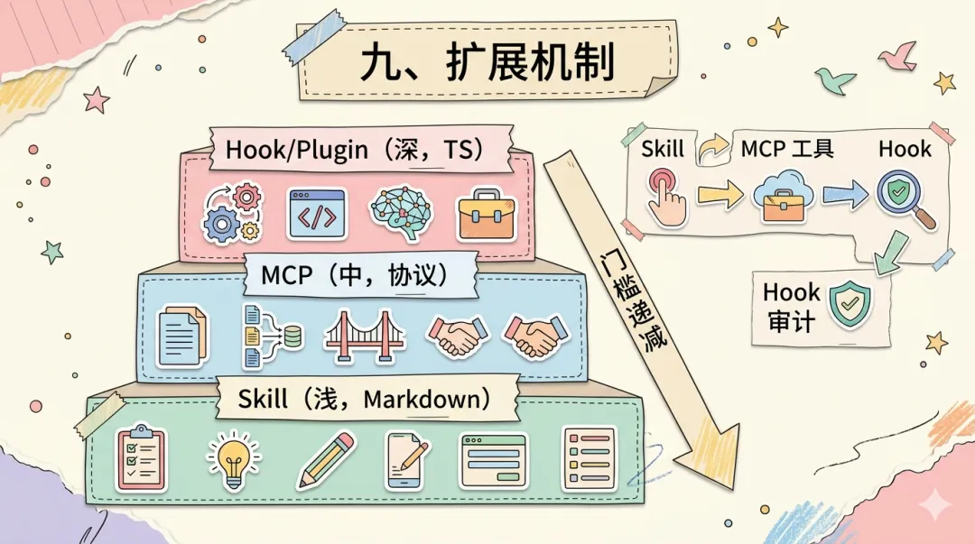 Claude Code 的答案是三层扩展体系,按介入深度递减:Hook/Plugin(深层)→ MCP(中层)→ Skill(浅层)。这种分层哲学与整体架构一脉相承——工具系统三层、Agent 协作三级,「多层递进、按需选择」是贯穿整个系统的架构模式。
