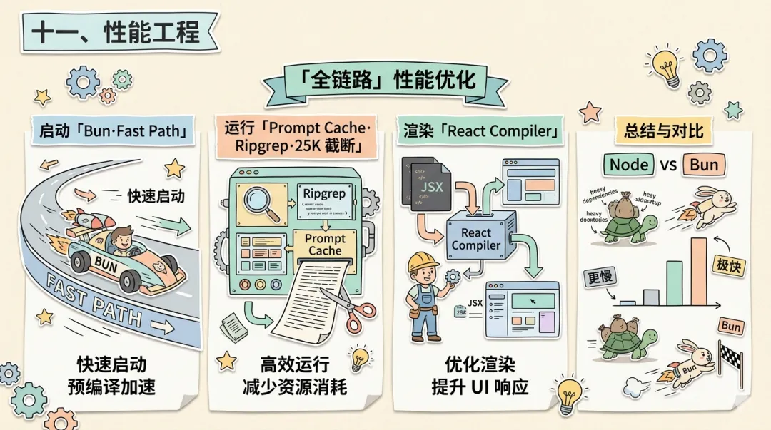 启动阶段 运行阶段 渲染阶段┌──────────┐ ┌────────────────────┐ ┌───────────────┐│ Bun 10ms │ │ Prompt Cache 90%↓ │ │ React Compiler││ Fast Path│ → │ Ripgrep 10-100x↑ │ → │ auto-memo ││ 并行预取 │ │ mtime 缓存 │ │ Feature Flags ││ │ │ 25K Token 截断 │ │ Dead Code Elim│└──────────┘ └────────────────────┘ └───────────────┘