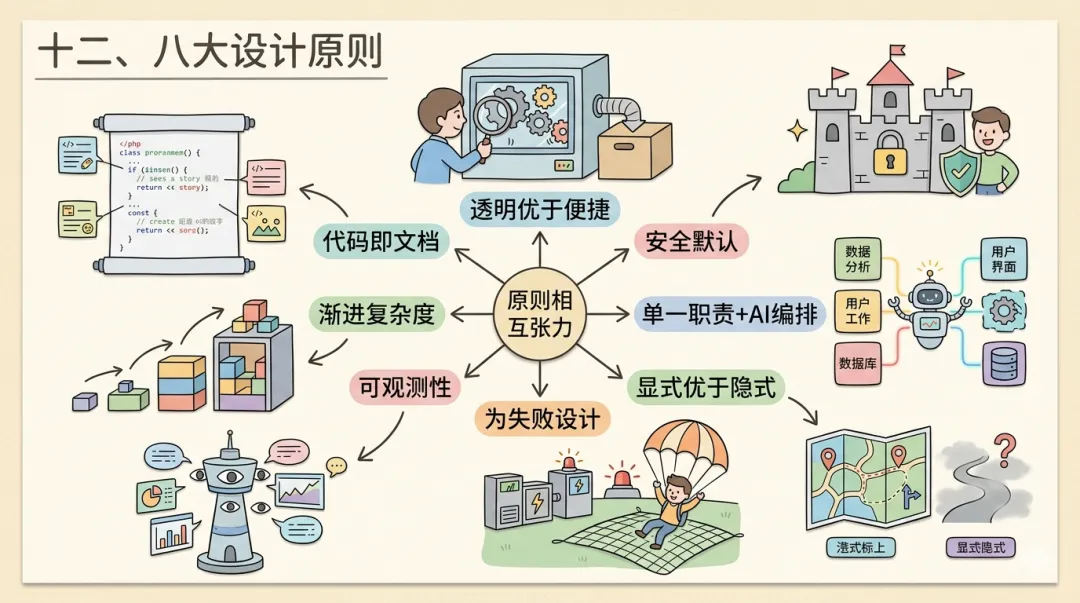• 原则间的张力是特性而非缺陷:「透明优于便捷」与「渐进复杂度」天然矛盾,成熟的架构决策就是在张力中找到当下场景的最优平衡。