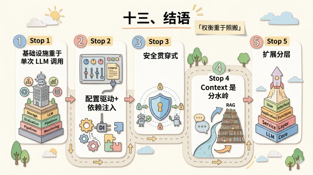 • 配置驱动 > 硬编码:同一个 Engine 搭配不同 Config 即可生成不同类型的 Agent,这是「一套代码,多种形态」的关键模式。 • 分层治理:引擎层、工具层、上下文层、安全层各有明确职责边界,层间通过标准化数据结构通信。 • ReAct 循环必须有终止条件:感知 → 推理 → 行动 → 观察是通用范式,但必须设计明确的退出机制。