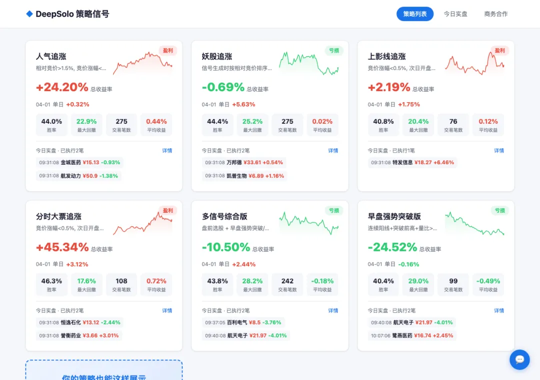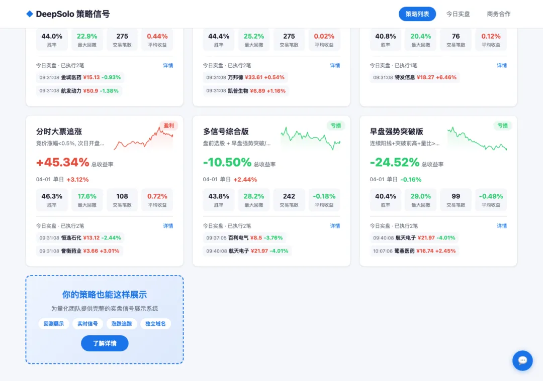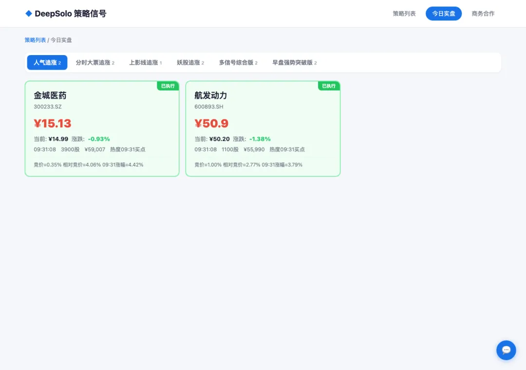 每个策略下面都有”今日实盘”区域,显示当天触发信号:
