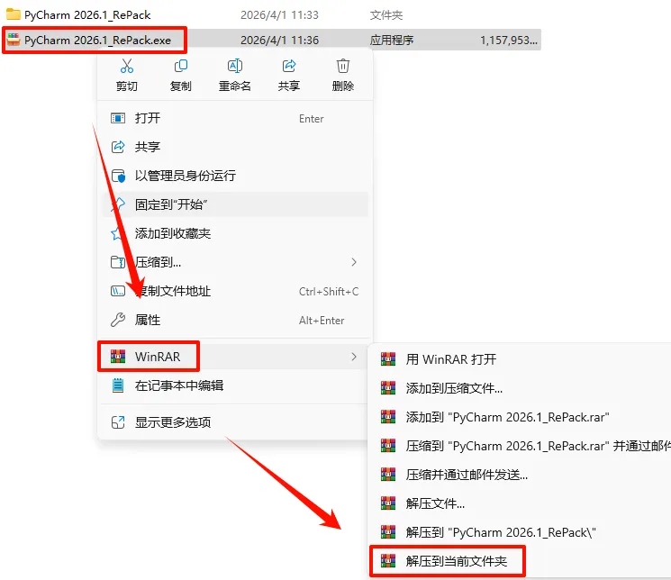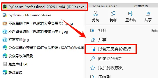 8.返回解压的文件夹,鼠标右键点击“PyCharm Professional_2026.1_x64-(IDE`a).exe”选择“以管理员身份运行”