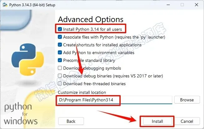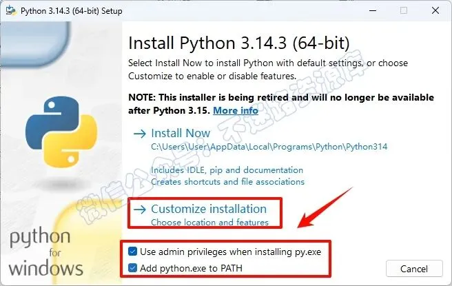 3.勾选““Add Python…“和“Use admin privileges….”,点击“Customize installation“