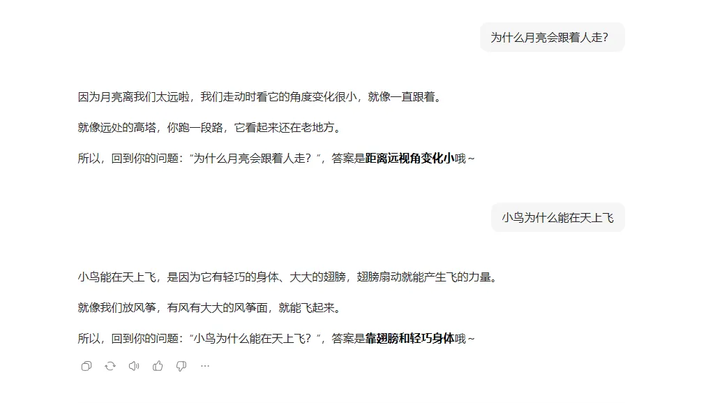 当AI给出”标准答案 + 知识扩展 + 背景信息 + 深层含义“时,小朋友听到后面就忘了前面,最后连最初的问题都记不住了。