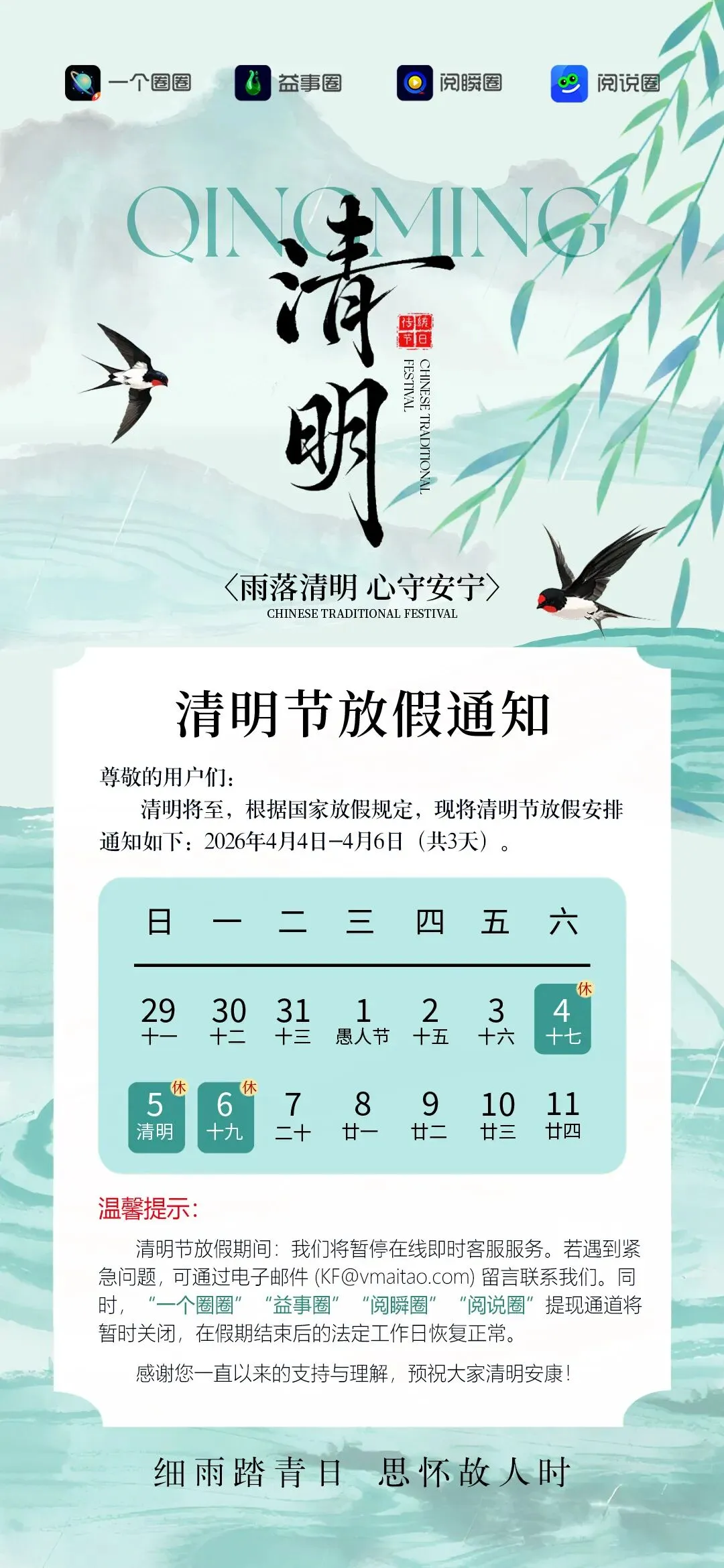 清明时节,雨润春归。在这缅怀先烈、祭扫先人、寄托哀思的传统节日来临之际,为保障大家的正常使用体验,结合国家法定节假日相关规定及公司运营安排,现将一个圈圈APP、益事圈APP、阅瞬圈APP、阅说圈APP,2026年清明节放假及服务调整事宜,郑重公告如下: