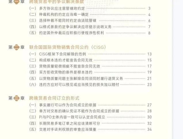 内容包括争议解决、CISG、合同订立、质量争议、损失赔偿、付款风险等,适合外贸、合规、法务学习参考。