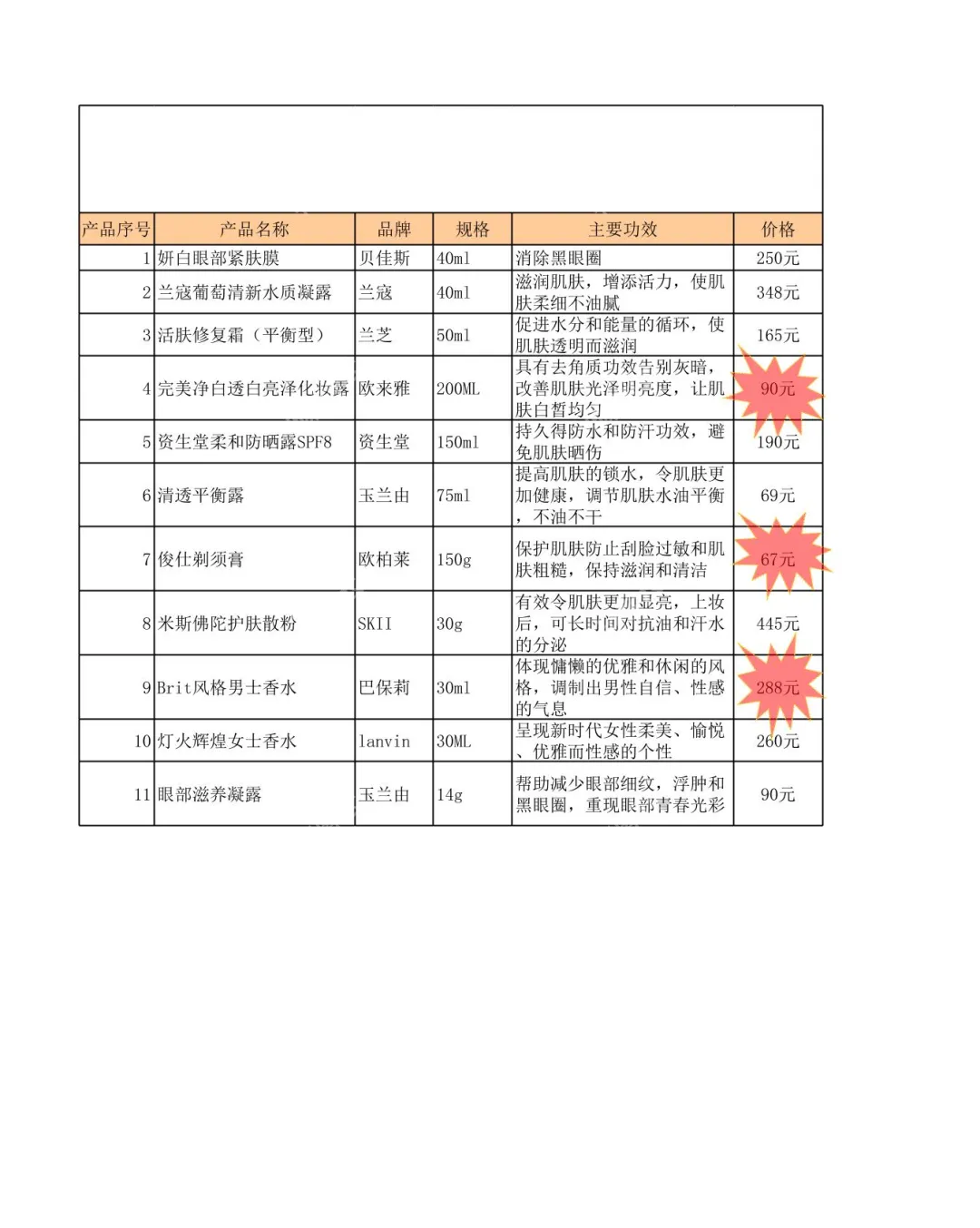 本文档是一份美妆护肤及香氛产品的信息汇总表,为消费者提供实用的选购参考。文档收录了贝佳斯、兰蔻、资生堂等11款热门产品,详细列出了每款产品的规格、核心功效及售价,涵盖眼部护理、面部护肤、男士护理、香水等多个品类,清晰呈现各产品的特色与优势。无论你是美妆爱好者、护肤新手还是有特定护肤需求的消费者,这份文档都能帮你快速了解产品信息,精准挑选适合自己的美妆护肤好物。