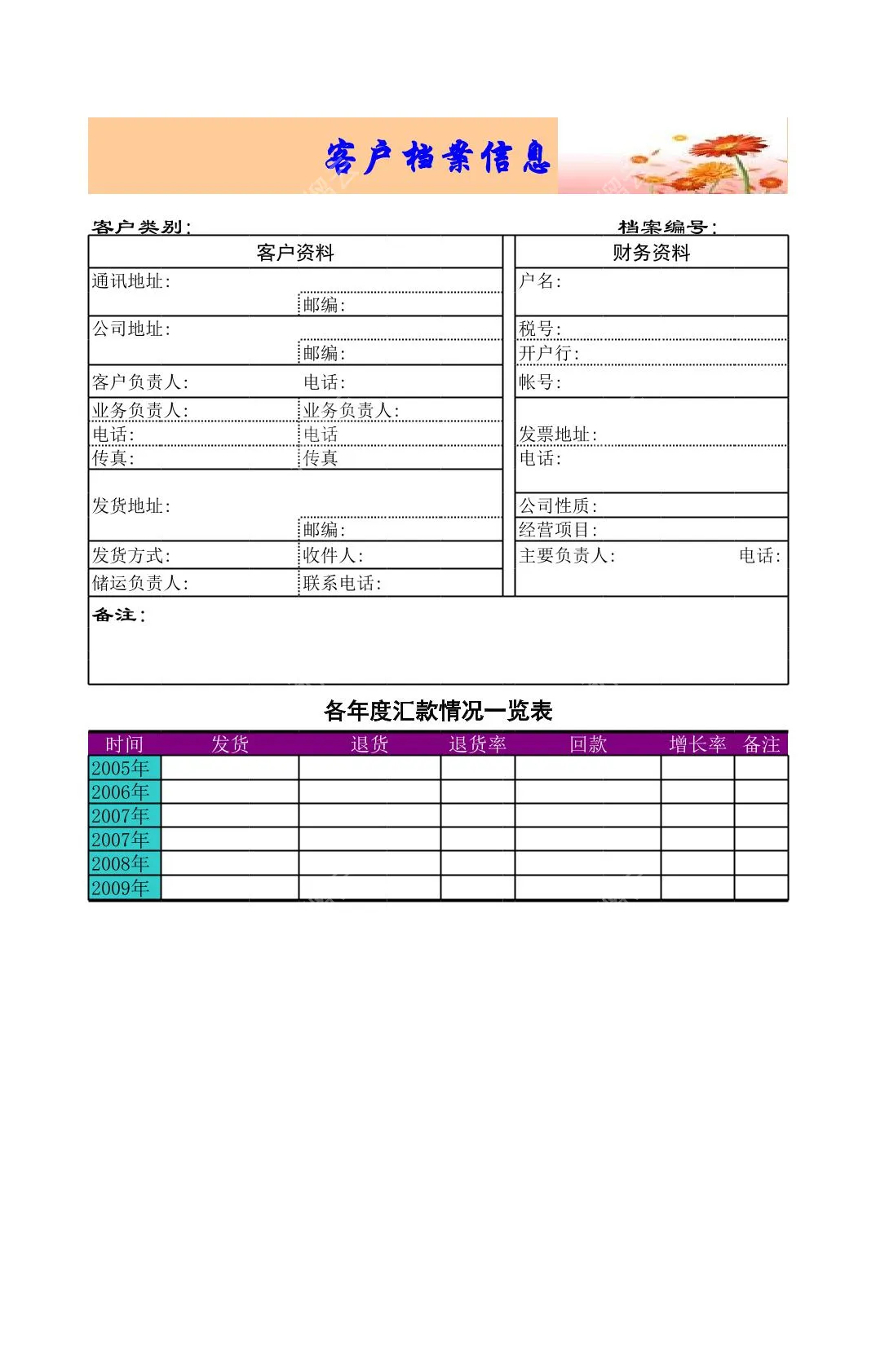 本文档是一份客户档案信息与年度汇款情况管理模板,旨在帮助企业规范客户信息管理与账款跟踪。文档涵盖客户基础资料、财务信息、发货储运信息三大核心板块,包含通讯地址、税号、发货方式、回款数据等关键信息项;还设置了各年度汇款情况一览表,可清晰统计发货、退货、回款、增长率等数据。通过标准化的表单结构,让企业能够系统梳理客户信息,精准追踪账款动态。无论你是企业行政人员还是销售财务从业者,这份模板都能为你提供客户管理与账款统计的实用框架,助你提升客户管理效率。