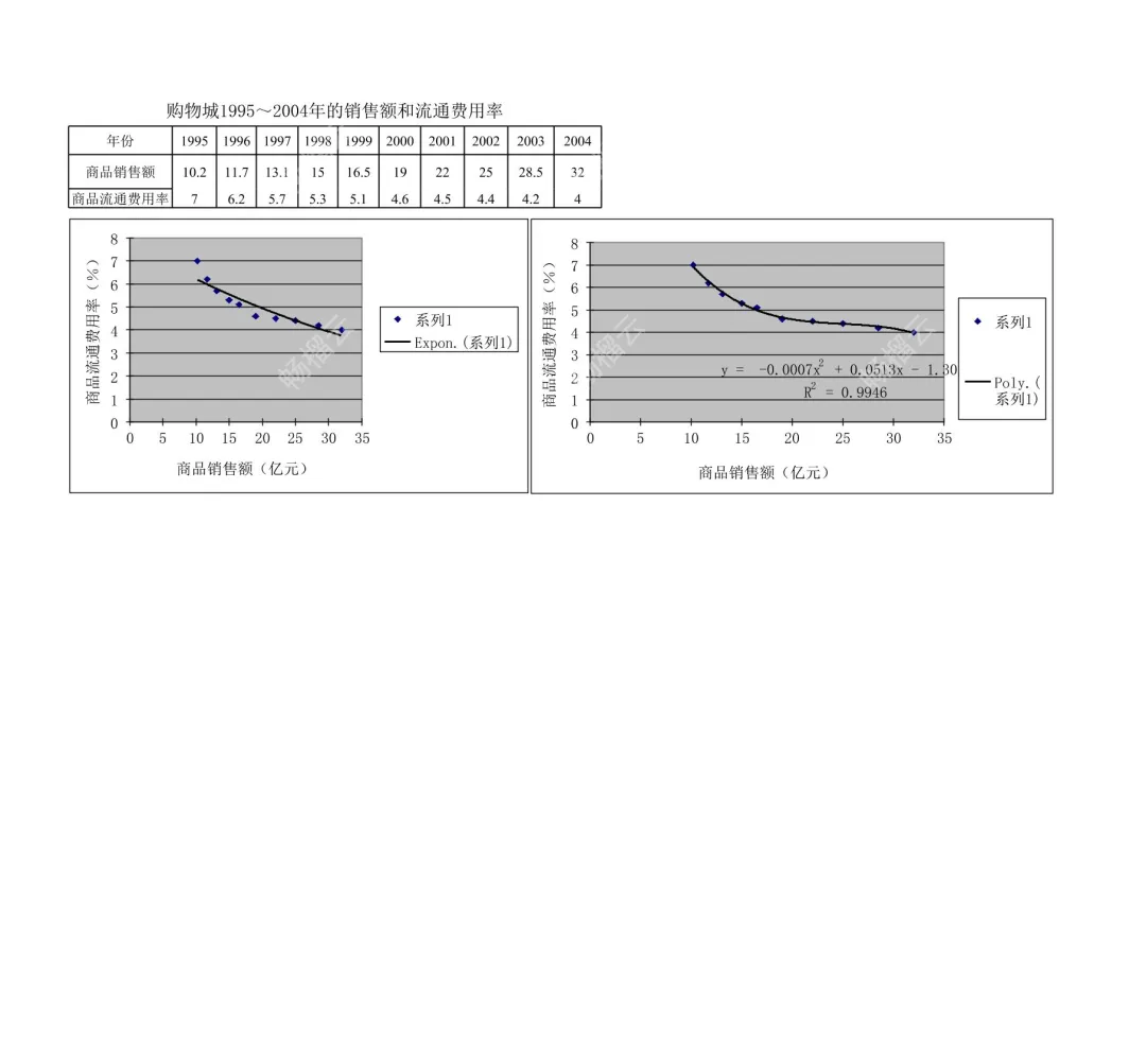 本文档是一份购物城十年经营数据统计表格,为零售从业者提供精准的经营参考依据。文档完整呈现了1995至2004年的商品销售额年度数据,清晰展示了销售额从10.2到32的增长趋势;同时收录了对应年份的商品流通费用率,呈现出从7.0逐年降至4.0的变化情况。数据准确直观,适合零售行业经营者、市场分析人员使用,可用于复盘经营状况、分析成本变化,助力制定科学的经营策略。