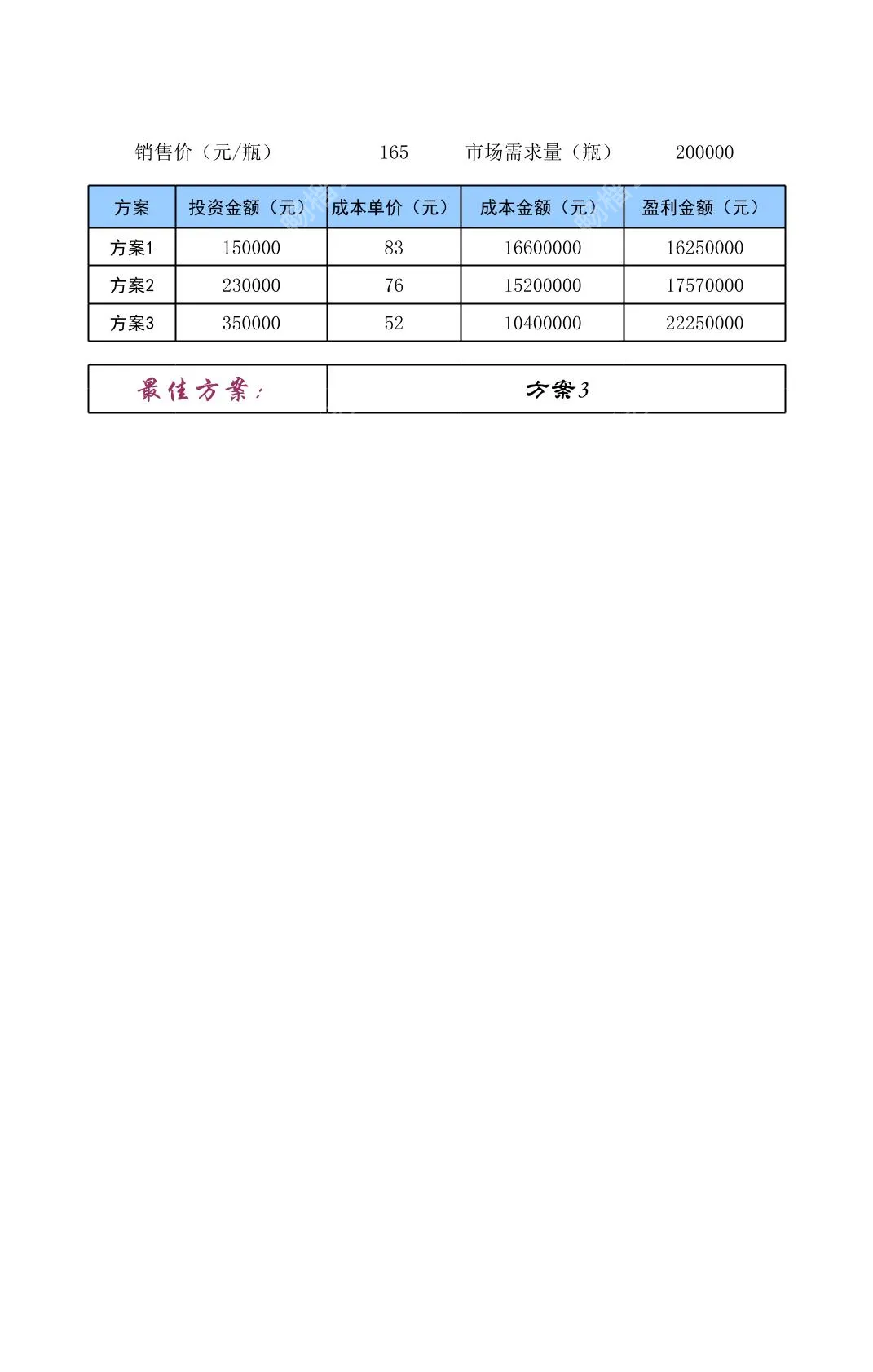 本文档是一份产品盈利测算方案对比表,旨在帮助企业决策者快速筛选最优盈利方案。文档详细列出了3种不同投资方案的核心数据,包括各方案的投资金额、成本单价、成本总额及盈利金额,通过清晰的数值对比直观呈现不同方案的收益差异;同时直接给出了盈利最高的方案3作为最佳选择。无论你是企业运营人员还是投资决策者,这份文档都能为你提供精准的盈利数据参考,助你快速敲定高收益的运营方案。