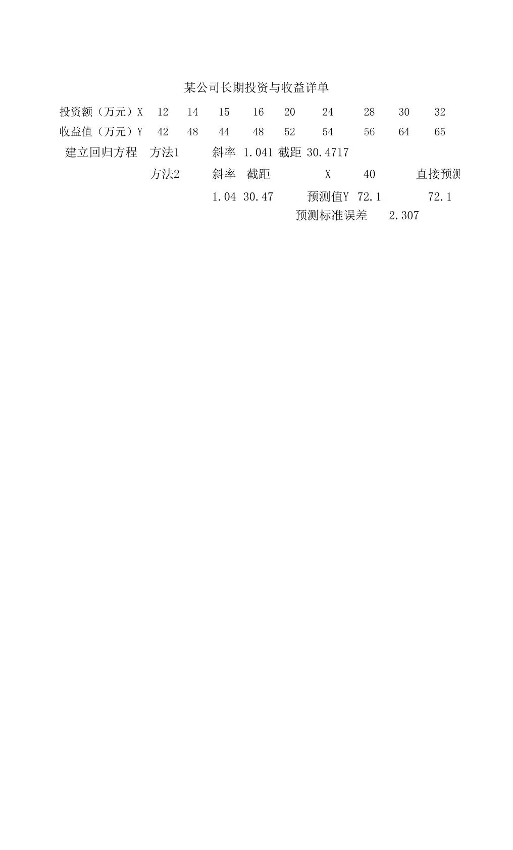 本文档是一份企业长期投资与收益的数据分析报告,旨在帮助投资从业者、企业财务人员掌握投资收益的关联规律与预测方法。文档详细展示了多组投资额与对应收益值的明细数据,通过两种方法建立投资收益回归方程,明确了斜率、截距等核心参数,还提供了投资额为40万元时的收益预测值及预测标准误差。无论你是企业投资决策者还是财务分析人员,这份文档都能为你提供投资收益的量化分析依据,助你精准预判投资回报。
