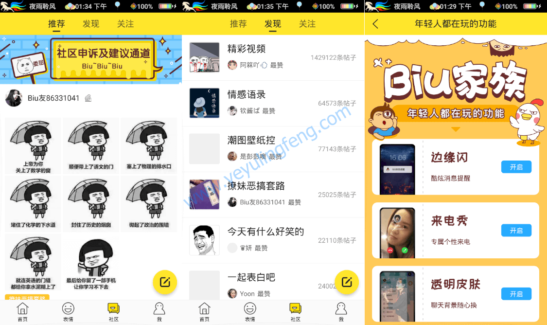 Biu神器自带社区版块,软件内注册过的用户均可以在该版块内发帖交流,可以将一些生活琐事分享出来,也可以将新鲜制作好的精彩短视频或图片分享至社区。另外一些拓展功能如:来电秀、边缘闪、透明皮肤等功能也是非常的使用但是需要额外下载安装应用才能实现。