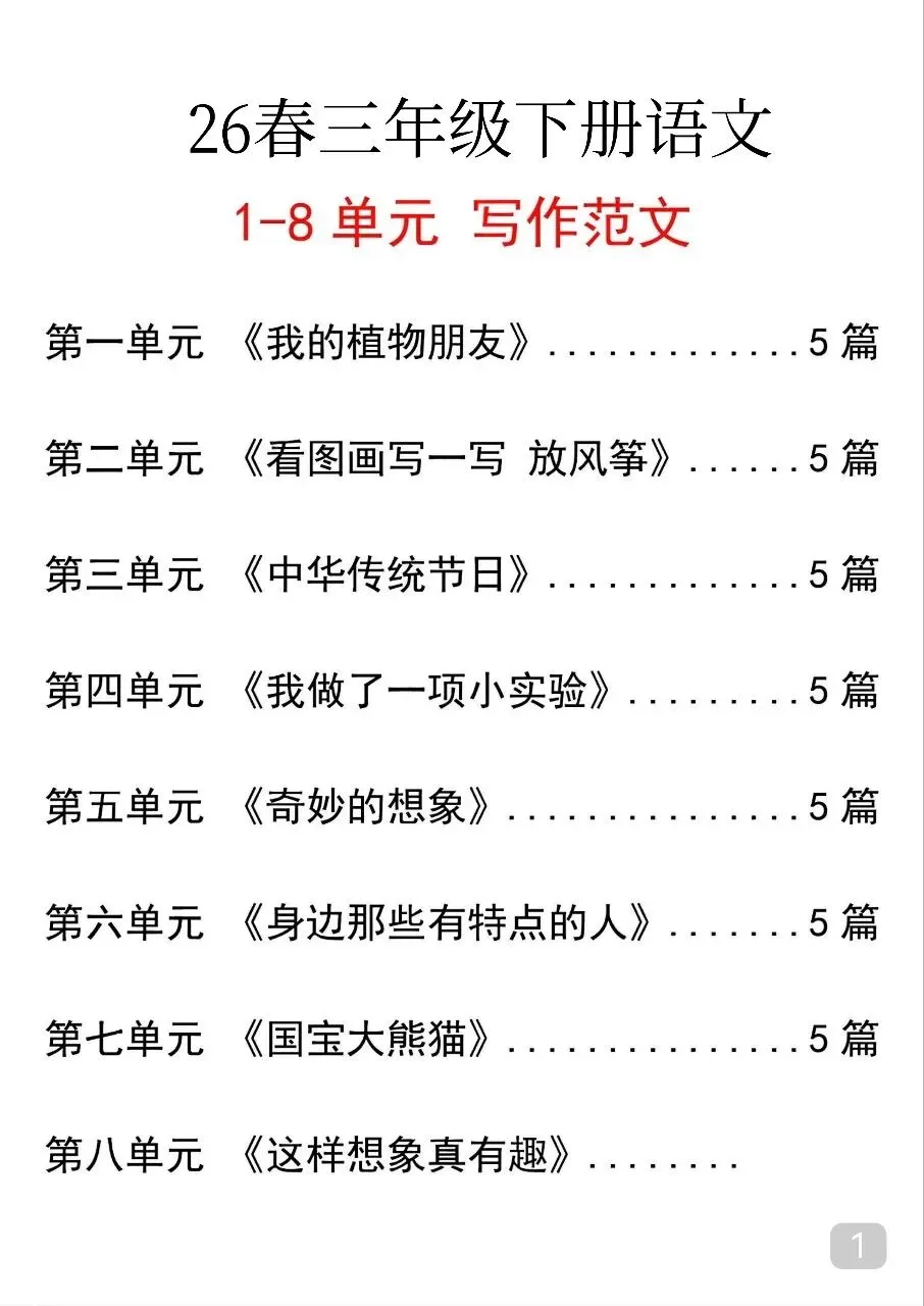三年级(下)语文 单元写作范文汇总.pdf 篇幅有限,无法全部展示。 请按照文末方式领取,无门槛永久免费,欢迎转发,帮助更多有需要的人~ 温馨提示: 文末有完整电子版领取方式! 领取完整电子版: ①:点一点右下角的“👍”和“❤️” ②:在公众号对话框中回复“资料1628”