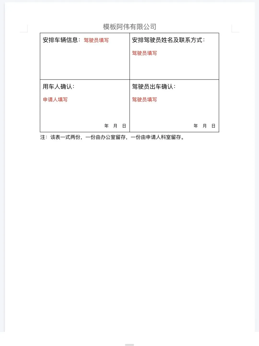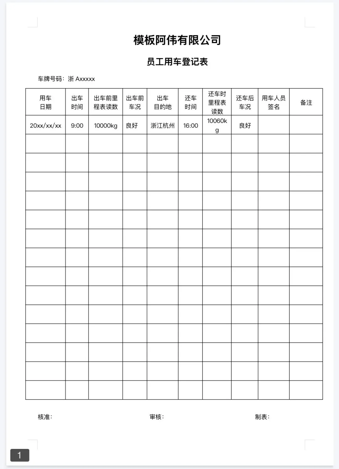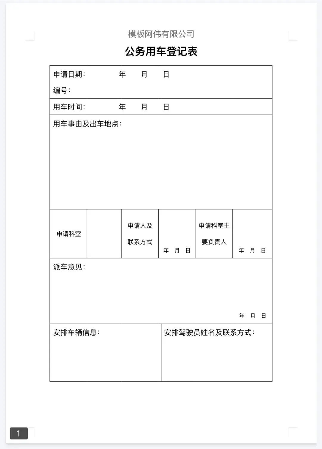 公司员工车辆用车登记表模板(word可编辑),电子版可下载
