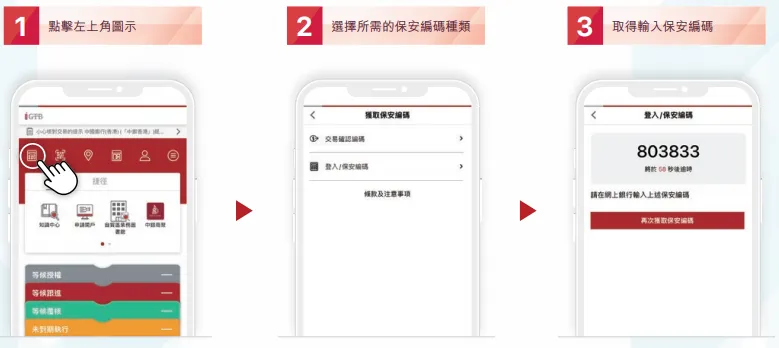 ✅ 如需获取保安编码,点击iGTB Mobile左上角图示,选择所需编码种类,即可获取对应动态编码;