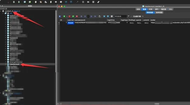 这里可以发现某个xxx1_5.db数据库文件中存在一个useraccount表,这里可以发现用户名,密码,手机号,ID等敏感信息,密码是MD5加密的,所以是可以通过撞库方式破解的