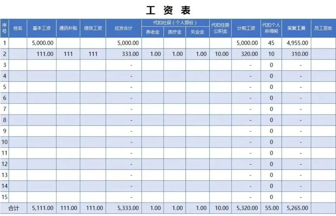 如下面这种就属于简单简洁的,包含了员工姓名、以及基本工资、绩效考核、通讯补贴以及五险一金等内容,更适合作为销售客服类的Excel工资条模板;