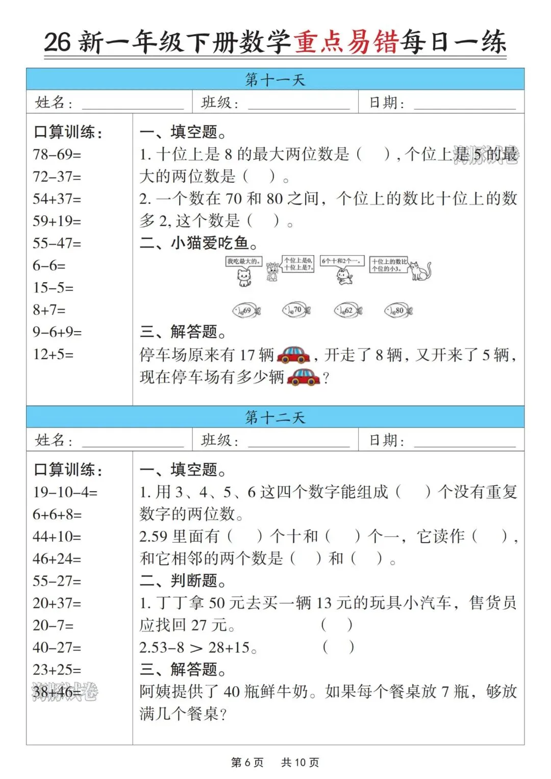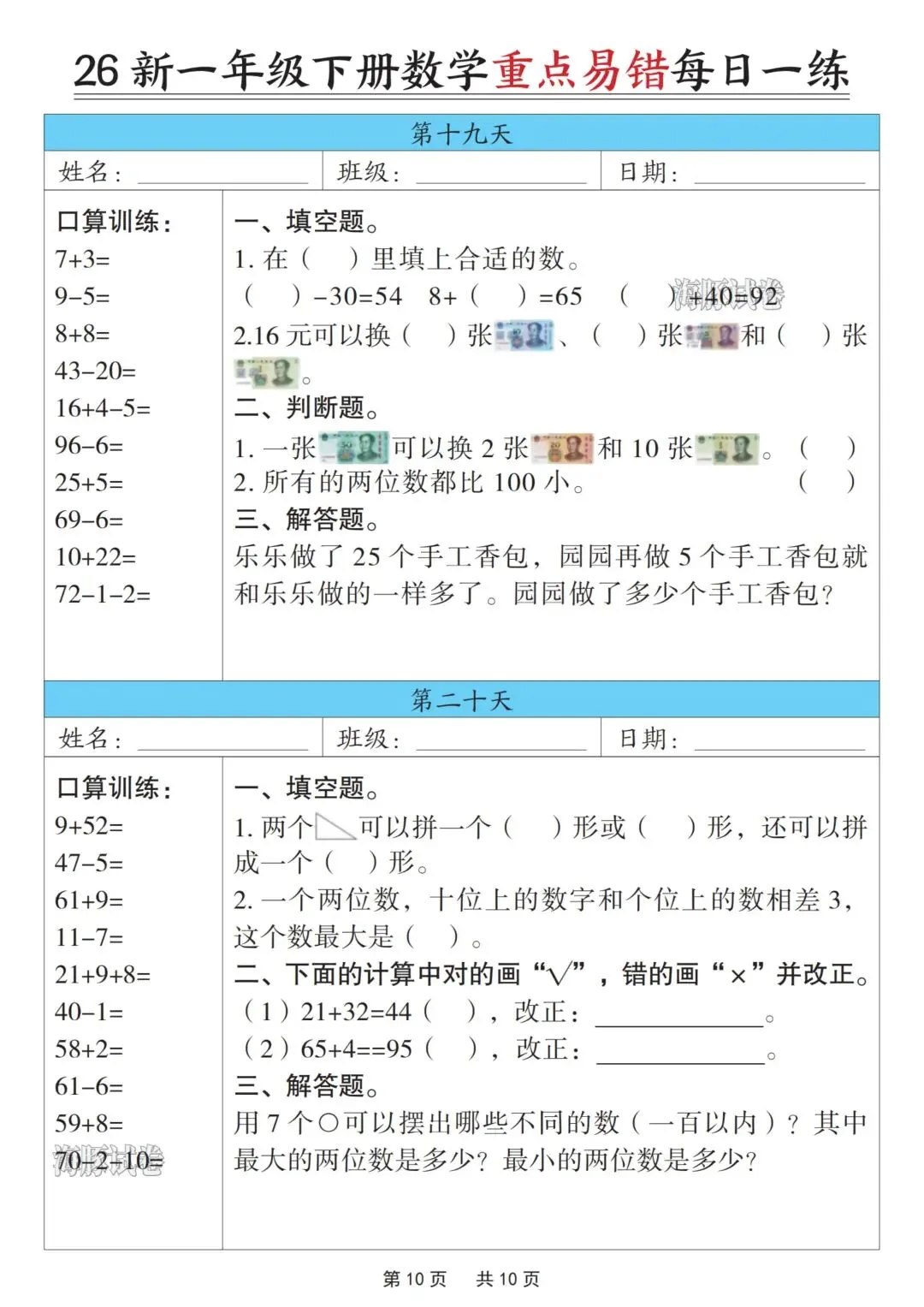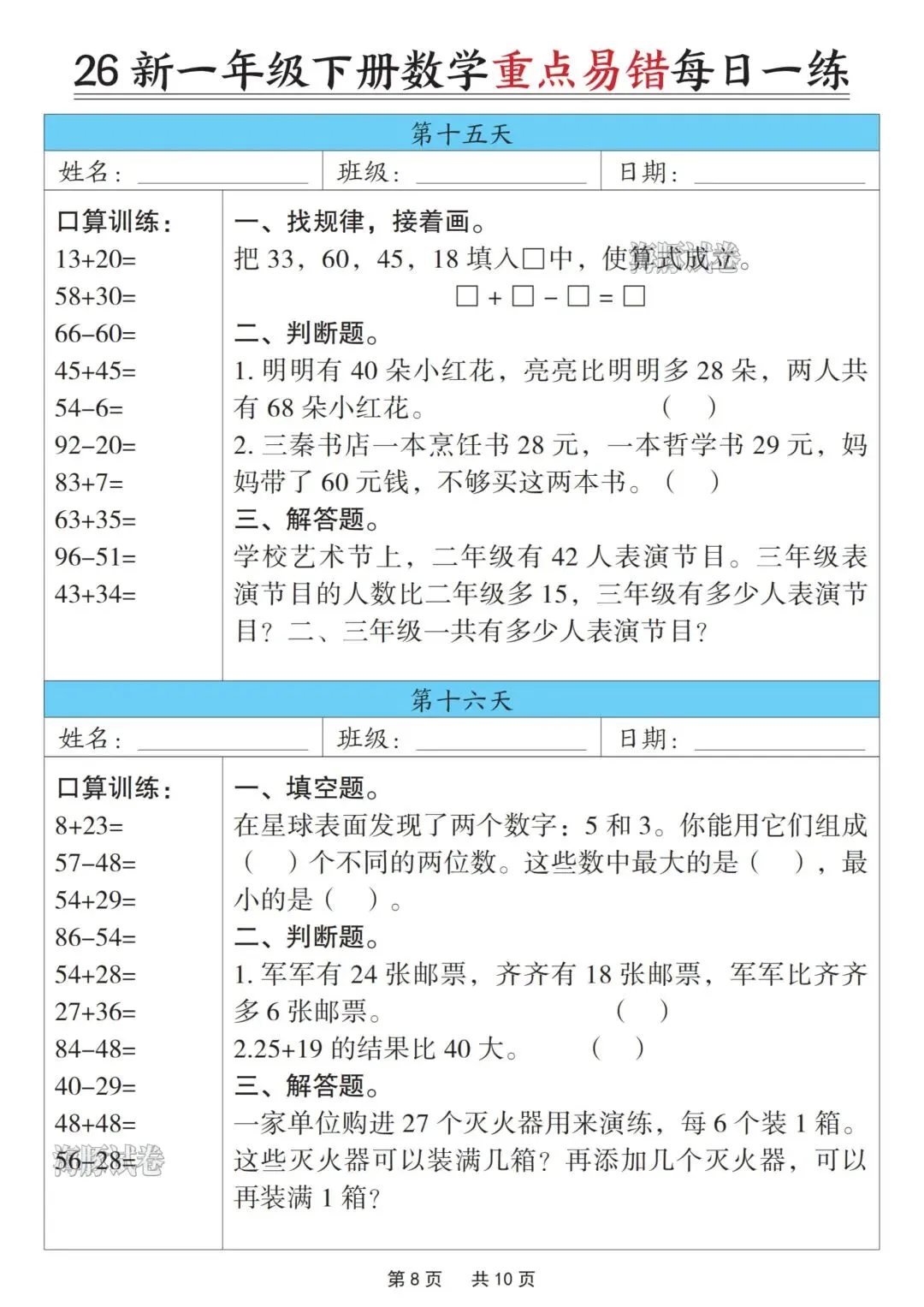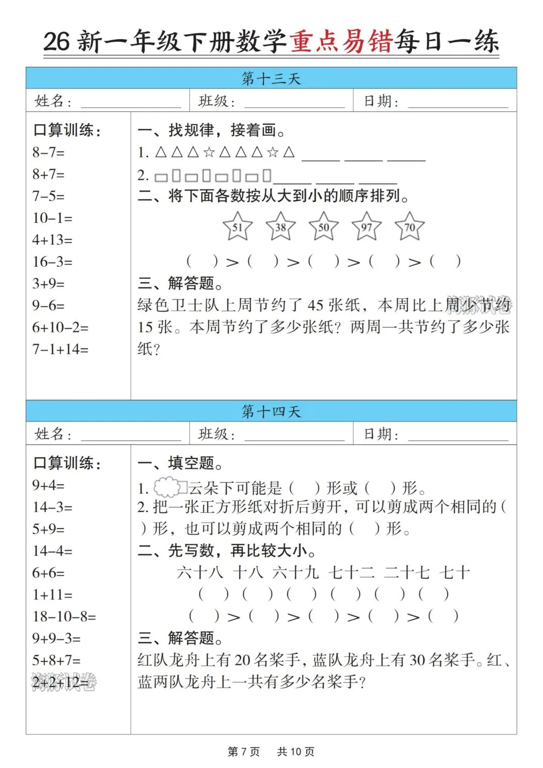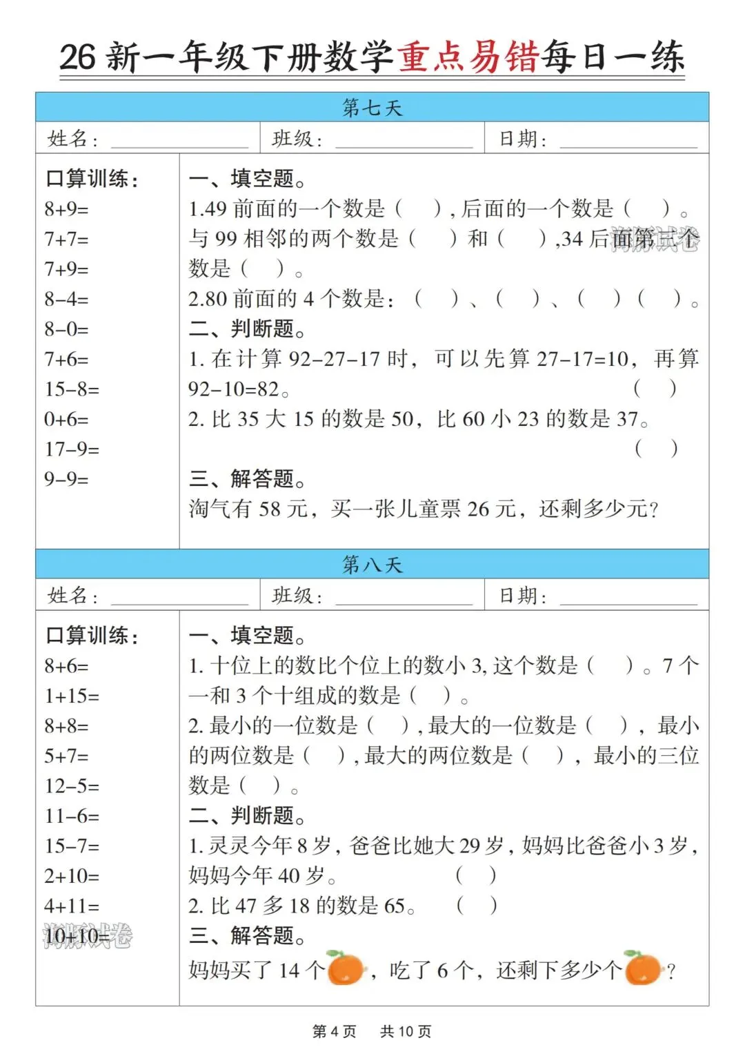 一年级下册数学重点易错每日一练,完整电子版可打印