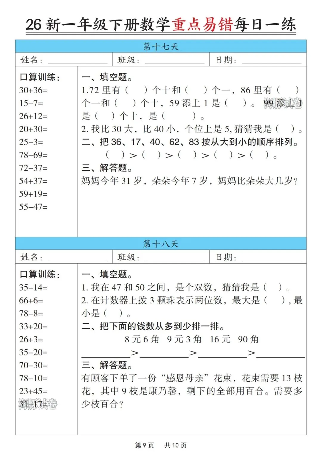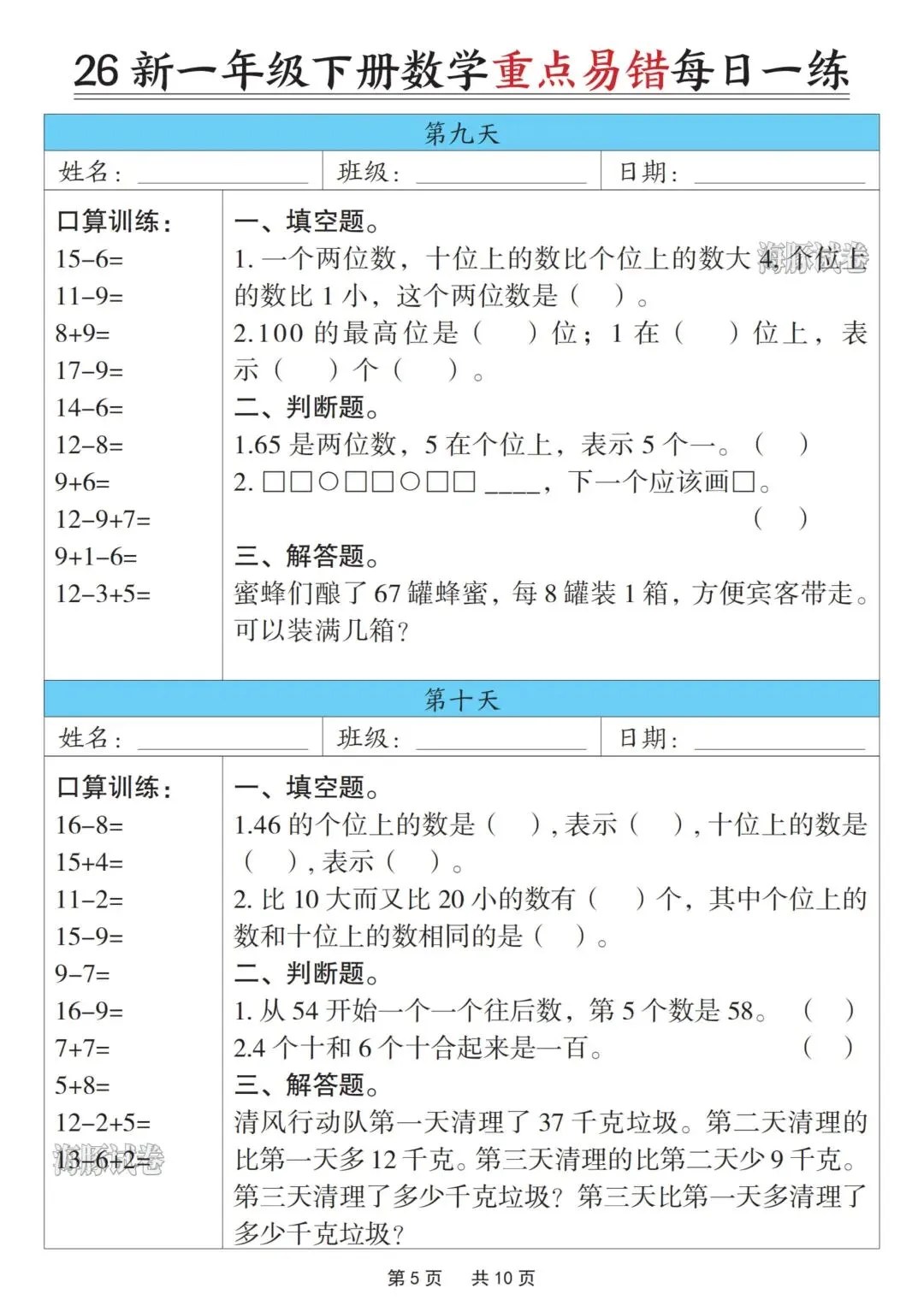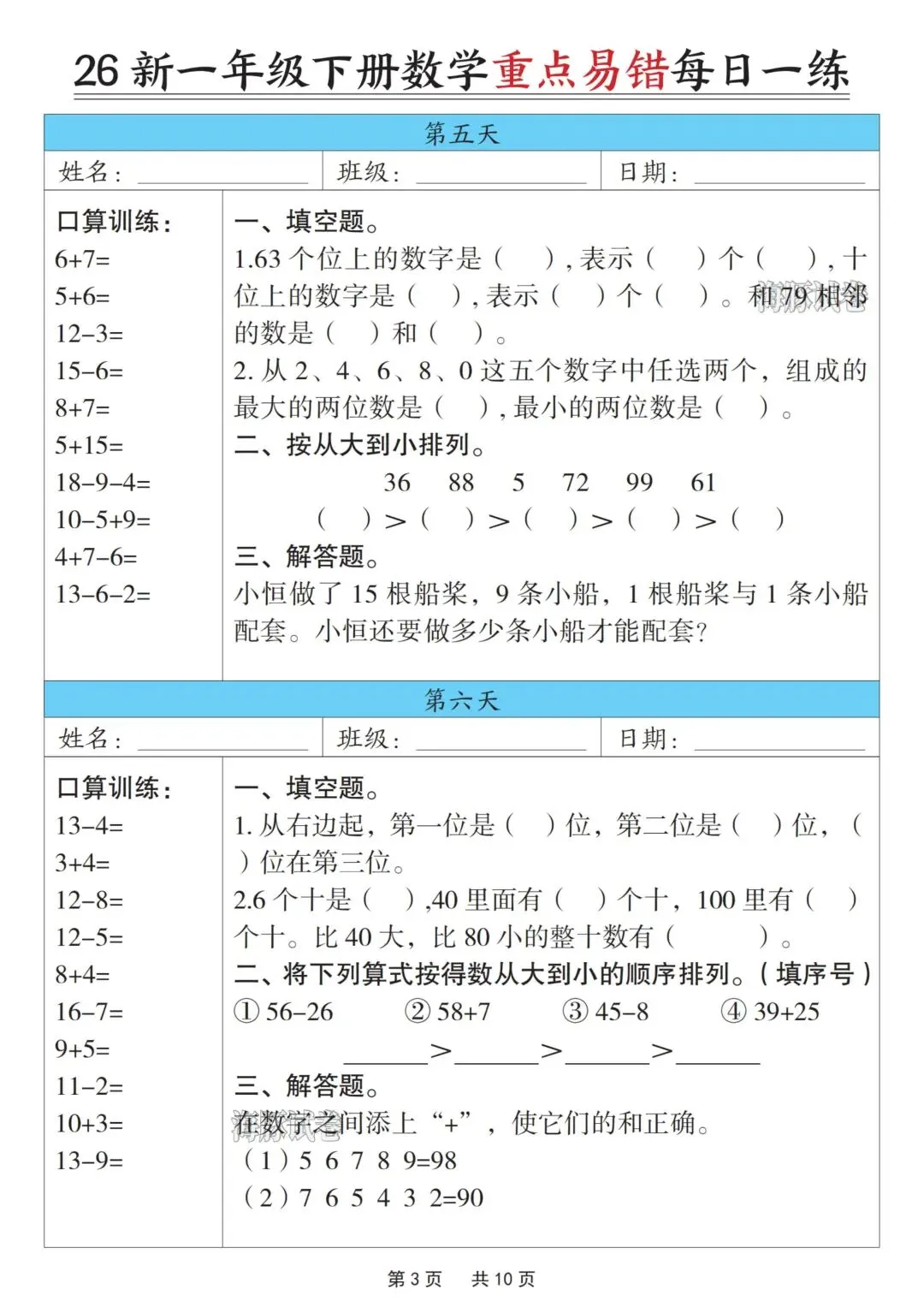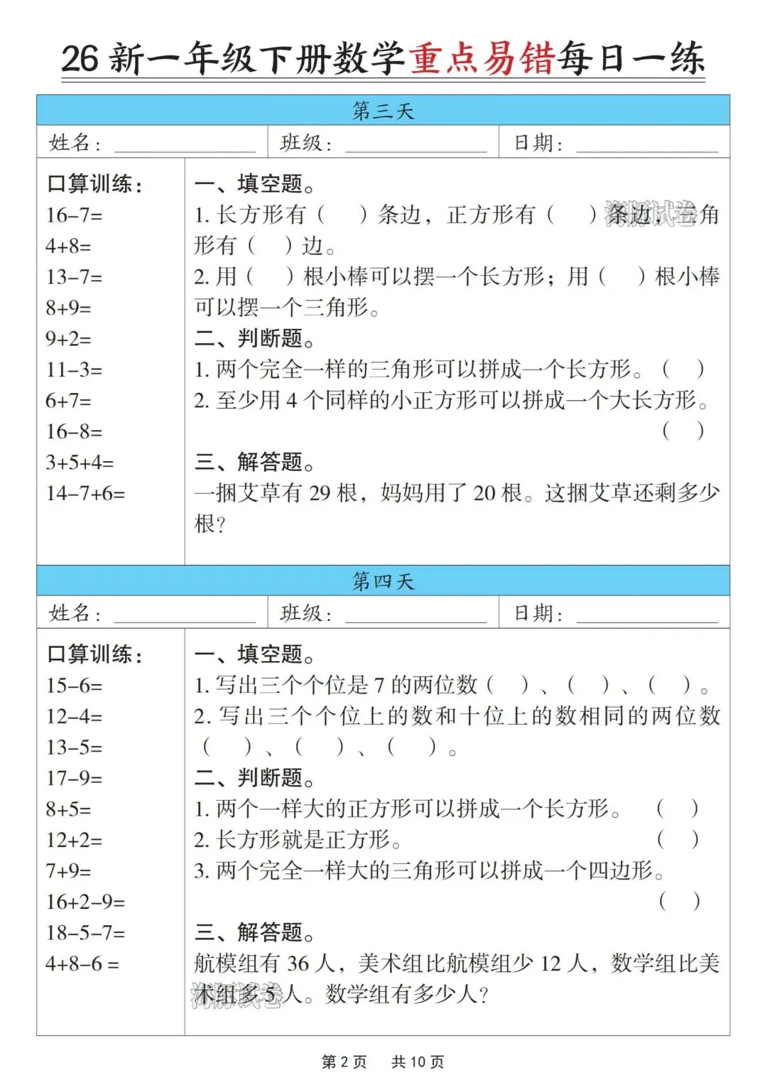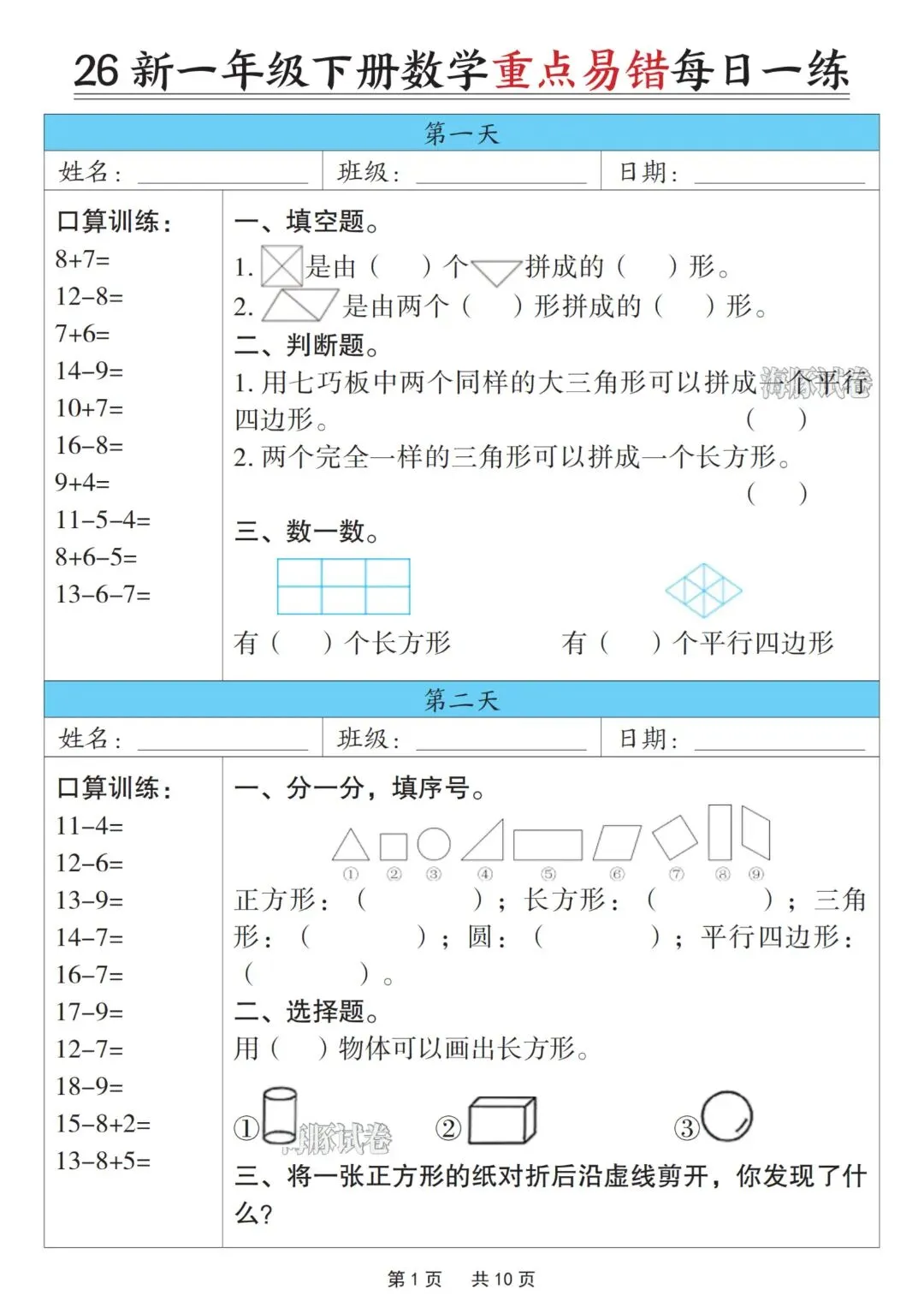 一年级下册数学重点易错每日一练,完整电子版可打印