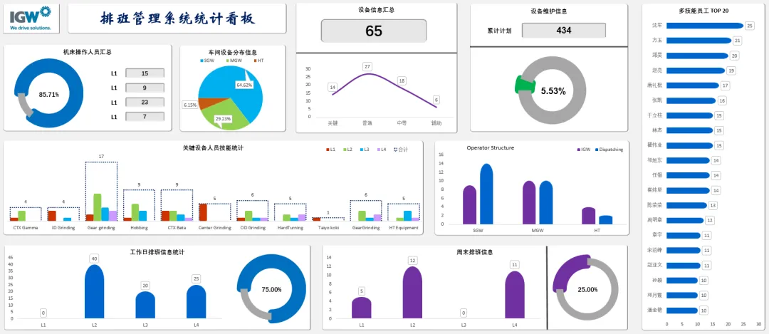 系统集成独立的数据分析看板,全方位统计关键指标:包括设备运行状态、人员技能等级分布、排班计划与执行情况。支持多维度查询,可实时查看个人或团队的出勤工时、设备累计运行时间及历史排班记录,为管理者提供数据驱动的决策支持。