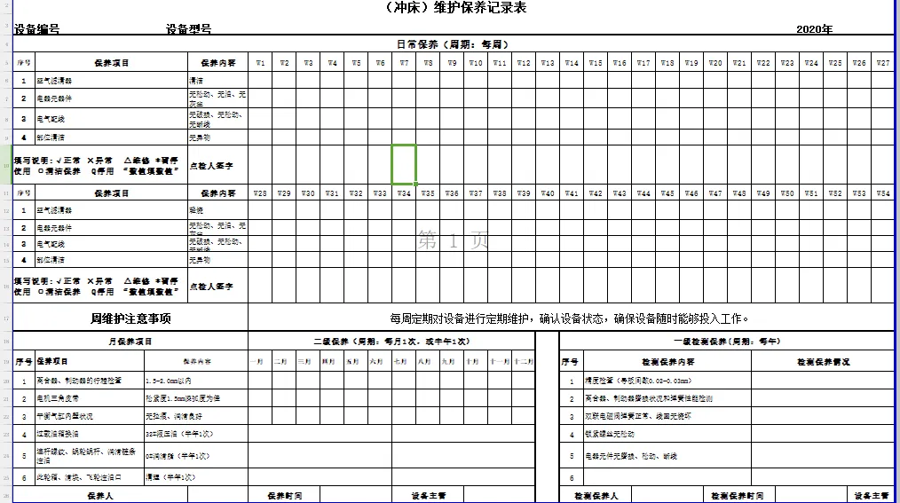 (冲床)维护保养记录表–Excel编辑档可获取! 质量文库:质量人的资料库 (冲床)维护保养记录表 序号 保养项目 保养内容 1 空气滤清器 清洁 2 电器元器件 无松动、无油、无灰尘 3 电气配线 无破损、无松动、无断线 4 部位清洁 无异物 填写说明:√正常×异常△维修*暂停使用Ο清洁保养Q停用“数值填数值” 点检人签字 序号 保养项目 保养内容 1 空气滤清器 轻烧 2 电器元器件 无松动、无油、无灰尘 3 电气配线 无破损、无松动、无断线 4 部位清洁 无异物 填写说明:√正常×异常△维修*暂停使用Ο清洁保养Q停用“数值填数值” 点检人签字 周维护注意事项 月保养项目 序号 保养项目 保养内容 1 离合器、制动器的行程检查 1.5-2.0mm以内 2 电机三角皮带 松紧度1.5mm深弧度为佳 3 平衡气缸内壁状况 无拉痕、润滑良好 4 过载油箱换油 32#液压油(半年1次) 5 连杆螺纹、蜗轮蜗杆、润滑链条注油 0#润滑脂(半年1次) 6 此轮箱、滑块、飞轮注油口 清理(半年1次) 一级检测保养(周期:每年) 序号 检测保养内容 检测保养情况 1 精度检查(导板间歇0.02-0.03mm) 2 离合器、制动器磨损状况和弹簧性能检测 3 双联电磁阀弹簧正常、线圈无烧坏 4 锁紧螺丝无松动 5 电器元件无磨损、松动、断线 质量文库:资料获取 发送【质量培训】领取50个培训PPT 发送【质量书籍】领取399本电子书; 发送【质量报表】领取28份报表模板 发送【技能提升】领取200G办公资料; 发送【自助获取】领取更多学习资料; 点下方阅读原文,下载学习资料!