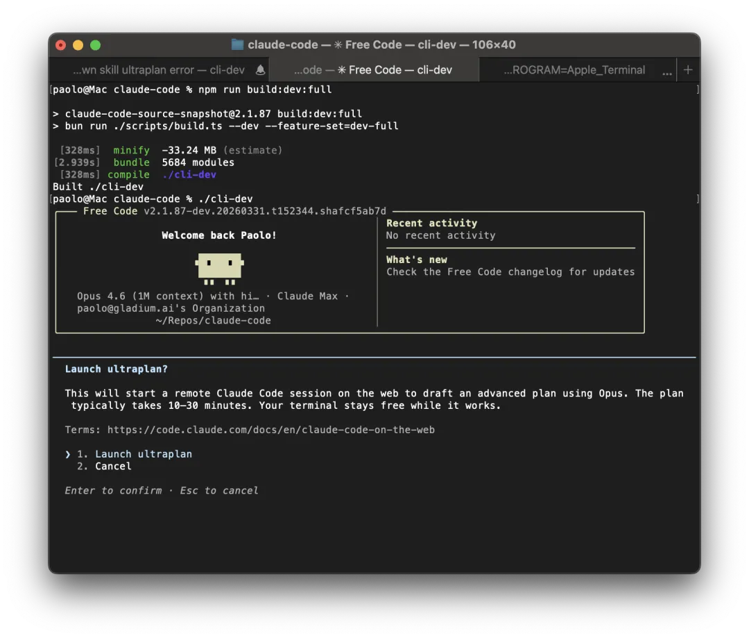 基于泄露源码的修改版,去除了 telemetry(遥测)、guardrails(安全限制),并解锁了实验性功能。 -