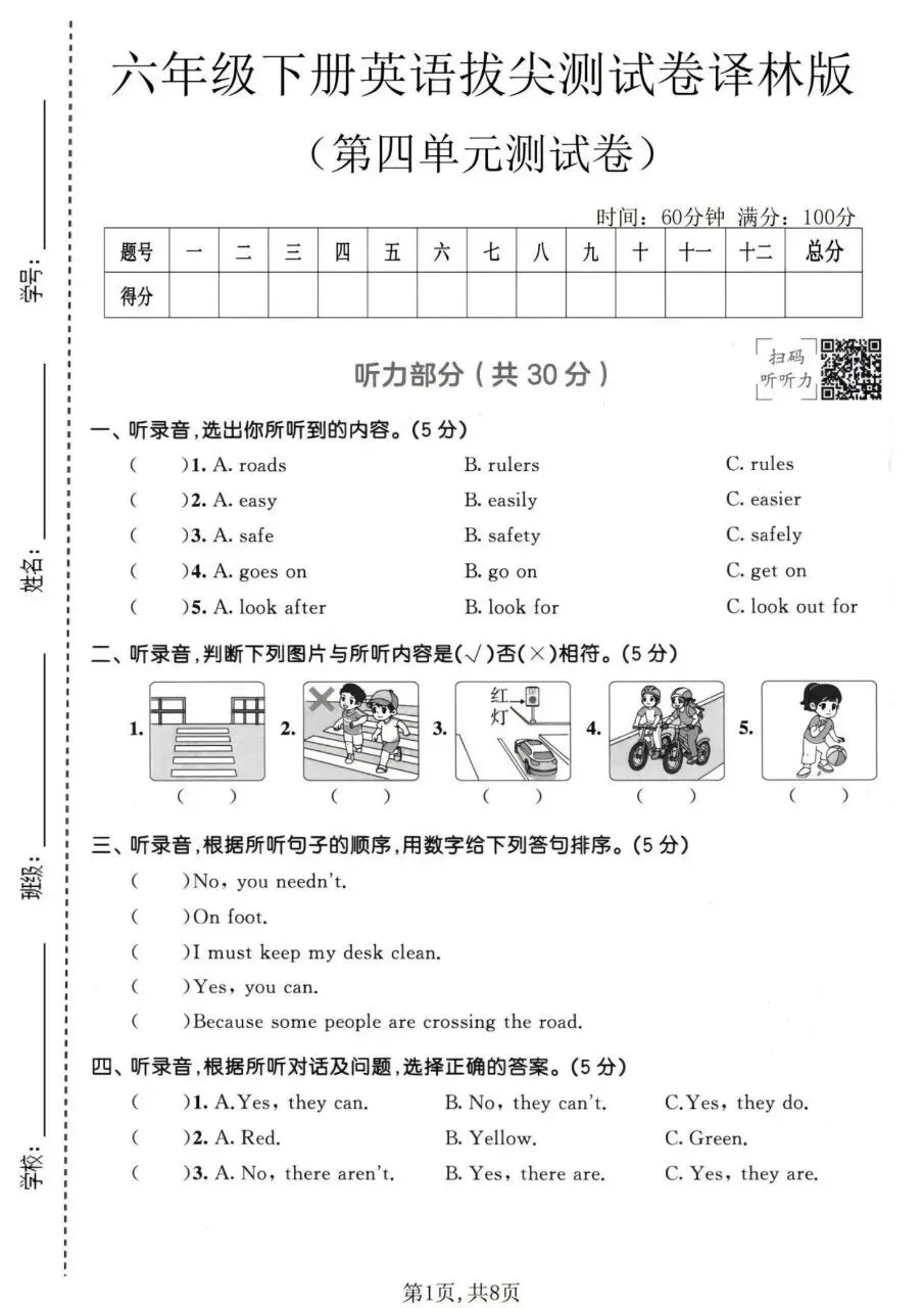 六年级下册英语拔尖测试卷译林版(第四单元测试卷)电子版免费领取