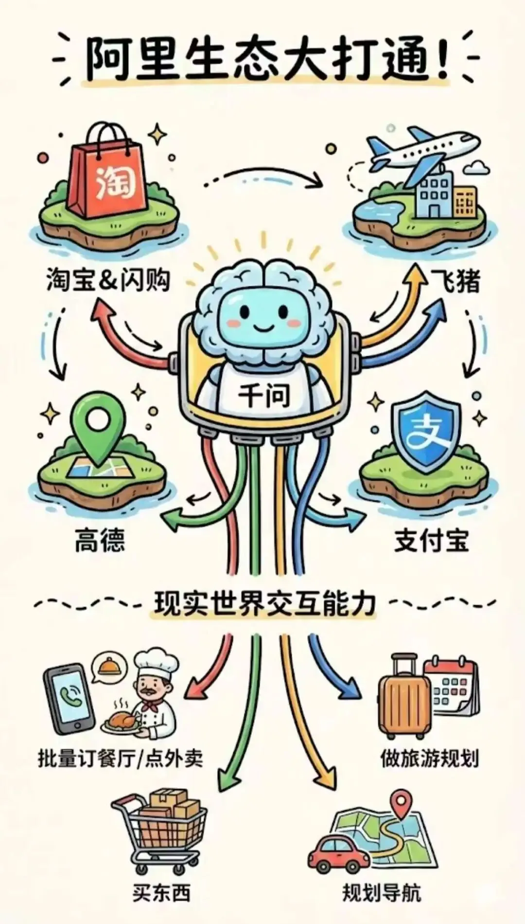 你把需求用话说出来,它帮你翻译成滴滴能懂的命令、支付宝能执行的指令。你感觉是在跟千问说话,但背后干活儿的还是那些你熟悉的平台。