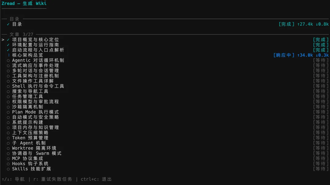这个基础 Wiki 就可以用 Zread CLI 生成。