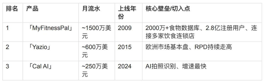 根据 AppMagic 数据(扣除应用商店抽成后),目前卡路里监测品类的头部格局是: