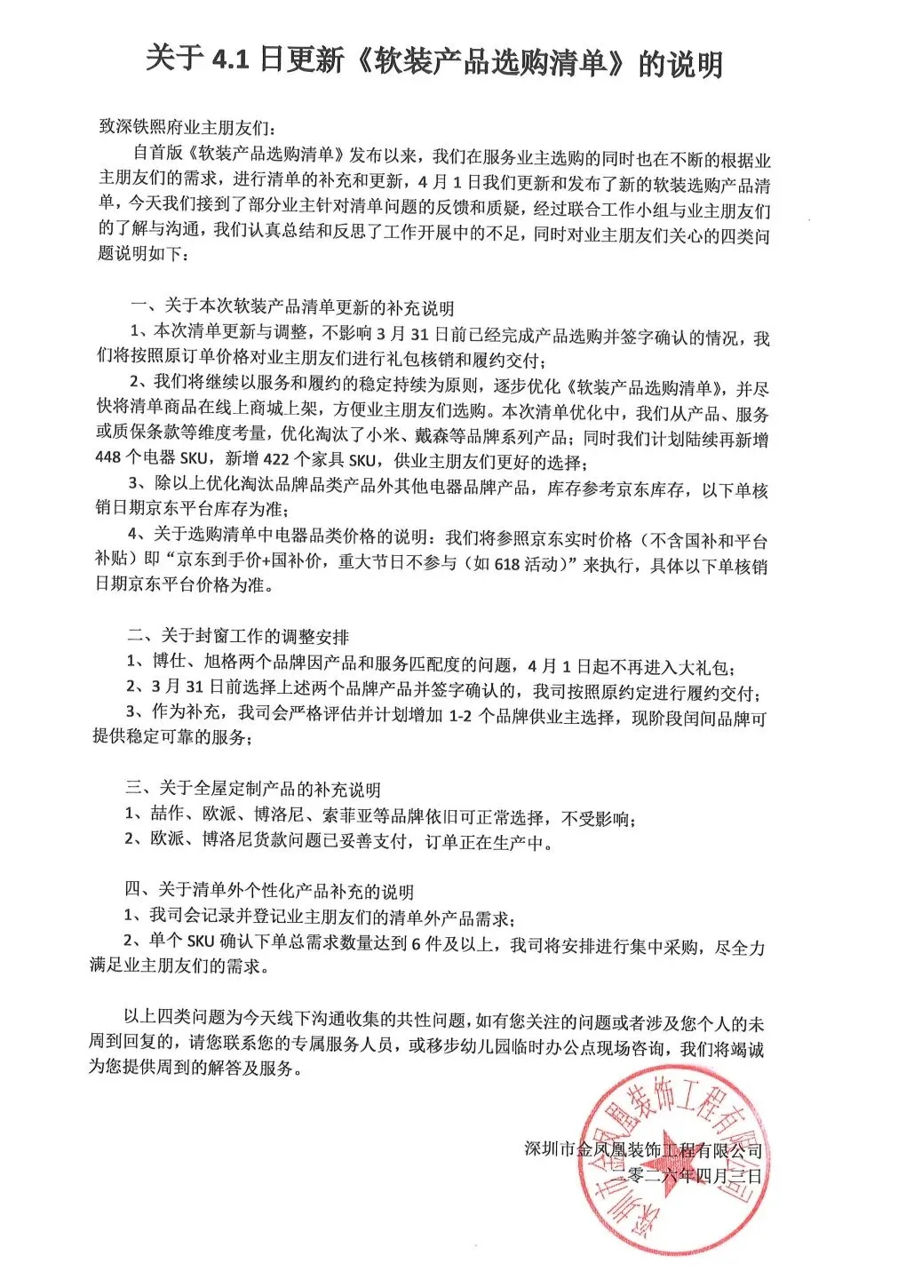 针对本次清单更新,金凤凰深铁熙府软装采购清单4.1更新说明发布,金凤凰装饰就业主关切作出回应装饰明确: