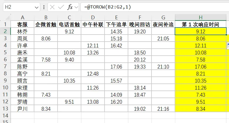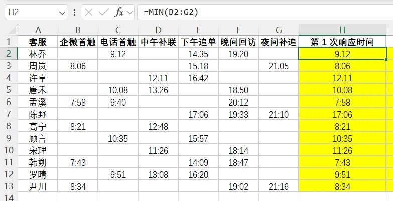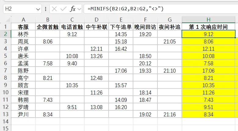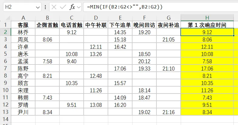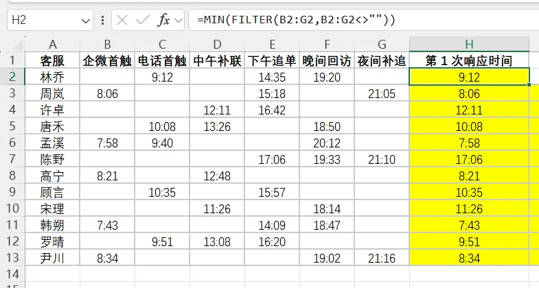 “第1次响应时间”本质是 从一堆单元格里,挑出最早的非空时间 。