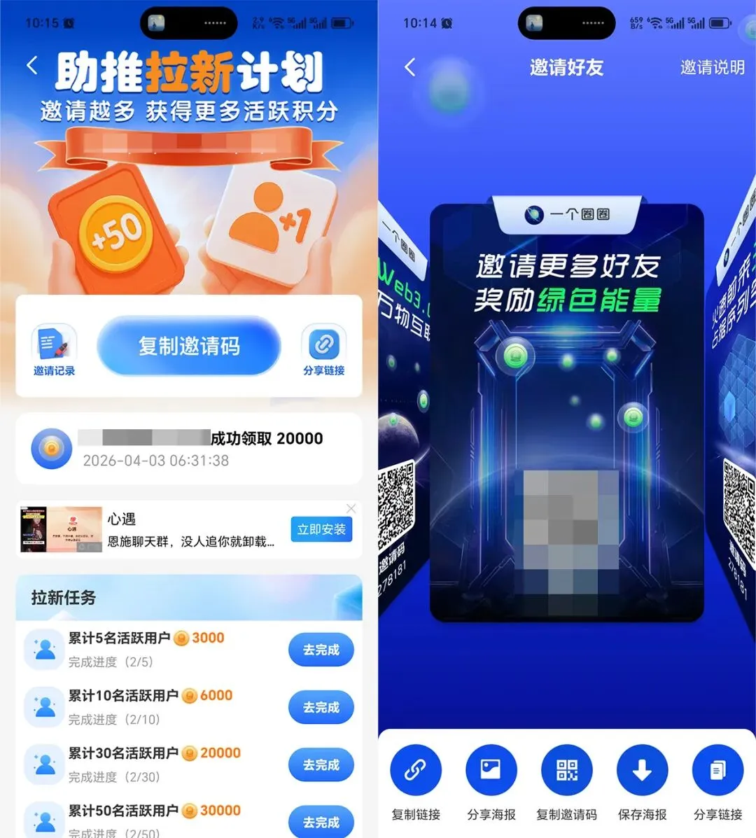 如果想让被动收入再上一个台阶,推广邀请好友是核心关键,也是一个圈圈APP最具优势的玩法: